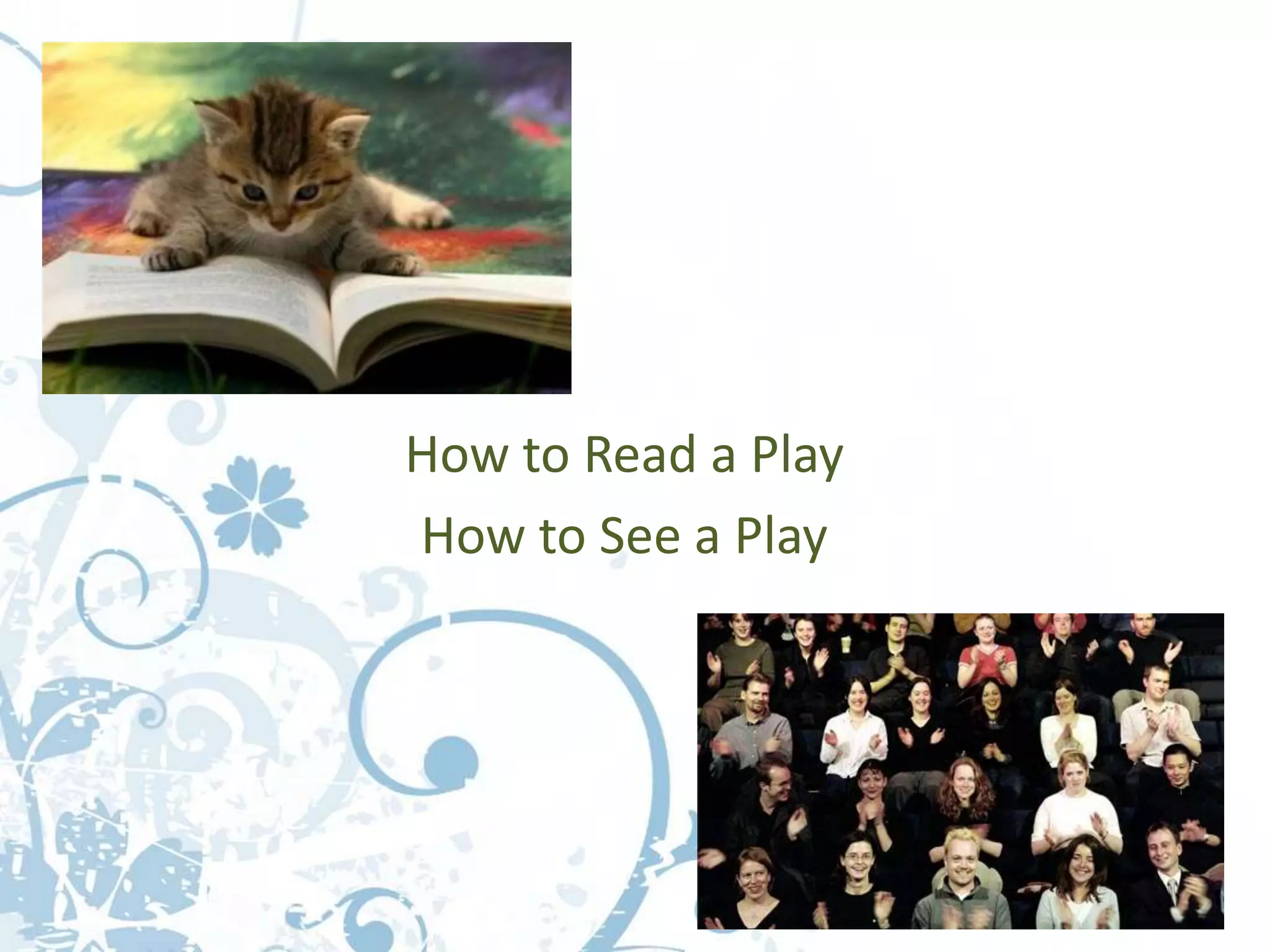 The document provides an overview of how to approach reading a play script. It discusses some key elements to look for in a script like the title, characters, and stage directions to understand the world of the play. It also contrasts reading a play script to seeing a live performance, as the reader must imagine and fill in many visual details left unspecified in the text. The article then discusses different genres of plays like tragedy and comedy and their defining conventions to help readers analyze and understand plays from different traditions.