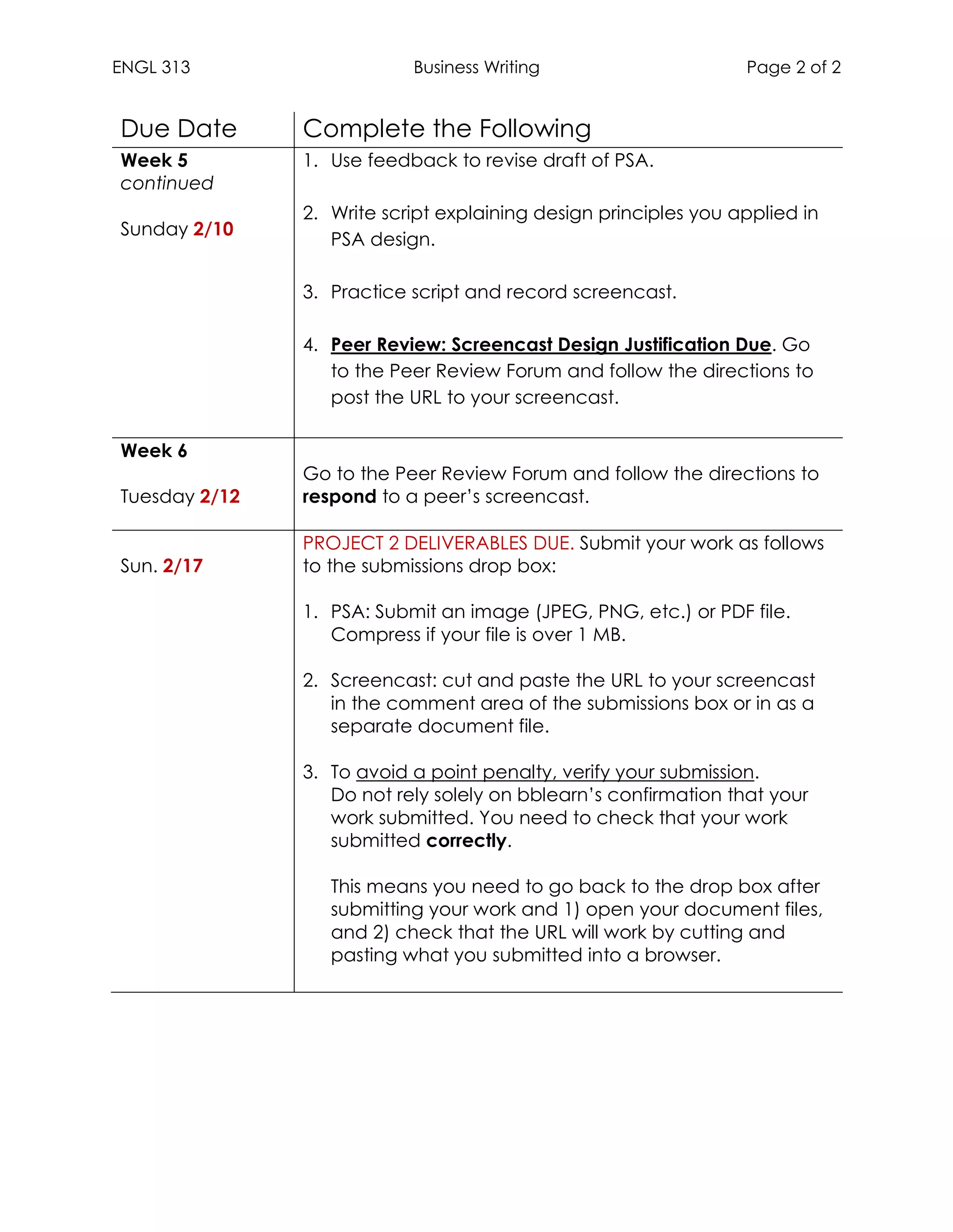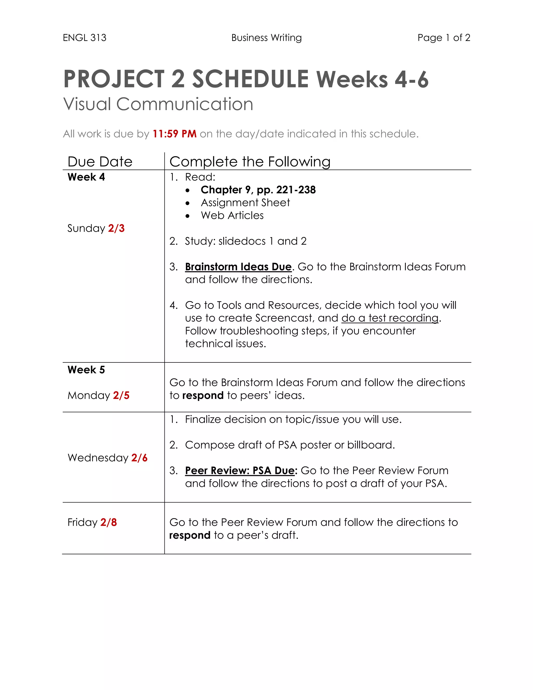 This document outlines the schedule and requirements for Project 2 of the ENGL 313 Business Writing course. It details the weekly deadlines and deliverables over the course of 3 weeks (Weeks 4-6). Students must complete readings, participate in peer review forums, design a public service announcement poster or billboard, record a screencast justifying their design choices, and submit all work by the final deadline of Sunday, February 17th. Students are reminded to verify their submissions are completed correctly.