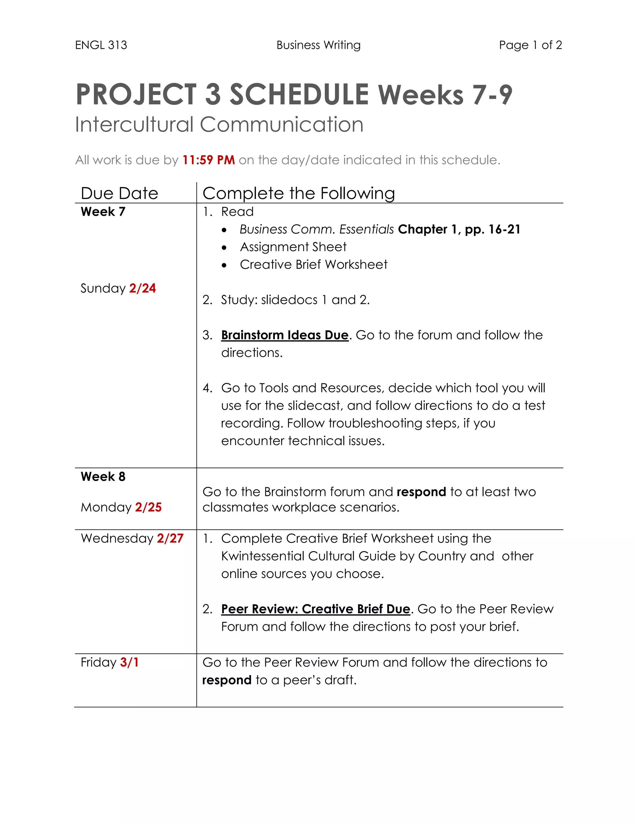 This document outlines the schedule and assignments for Project 3 of the ENGL 313 Business Writing course over 3 weeks. It details the weekly readings, discussion posts, and draft submissions for a creative brief and slidecast on intercultural communication. The project deliverables of submitting the final slidecast URL and verifying the submission are due by Sunday March 10th at 11:59 PM.