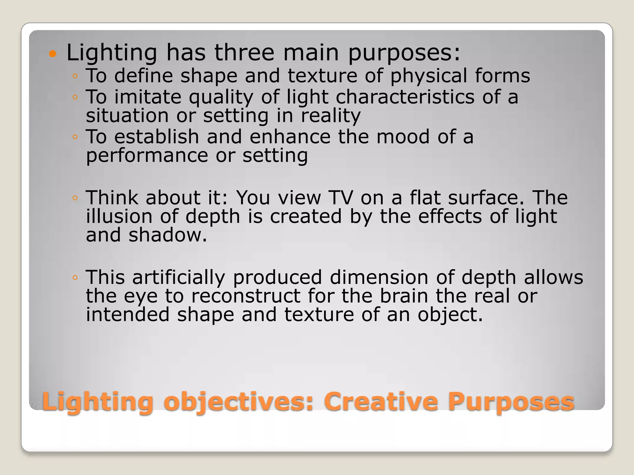 The document discusses the importance of lighting for video production, describing the different types of light sources and how lighting is used to define shapes, set moods, and create a sense of depth. It also covers lighting equipment options, basic three-point lighting setups, techniques for interview lighting, and tips for shooting on location.