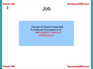 This document provides an introduction to Oracle Financials and its implementation. It discusses the job of an Oracle Financials functional consultant, which is to implement Oracle Financials modules according to a client's business requirements. It then provides an overview of Oracle Financials modules including Payables, Receivables, General Ledger, Assets, and Cash Management.