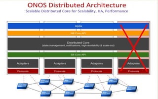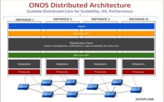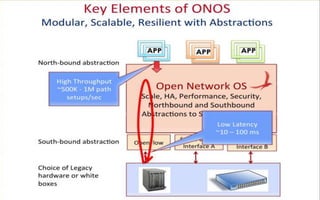 ONOS is a new carrier-grade SDN network operating system designed for high availability, performance, and scalability. It provides multi-layer SDN control, SDN-IP, segment routing, and network functions as a service. ONOS works through a modular architecture and processes flows through distributed components. It can achieve response latencies between 10-100ms and supports deployment through Docker containers.