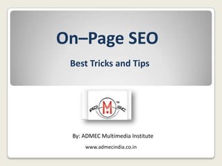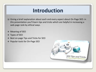 The document discusses various on-page SEO tips and tricks for optimizing a website. It covers topics like domain names, page names, image optimization, titles, meta tags, heading tags, links, and content. Specifically, it recommends including keywords in domain names and page URLs, optimizing image alt text, using keywords in titles, including 4-6 keywords in meta tags, and ensuring unique high-quality content with proper keyword density. The document provides guidance on best practices for on-page SEO elements to improve search engine rankings.