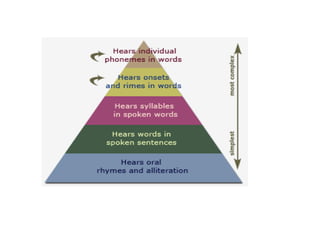 This document summarizes a meeting to train pre-K and kindergarten teachers on teaching the phonological awareness skill of onset and rime. The goals of the meeting are for teachers to develop a lesson on onset and rime and for students to be able to segment words into onsets and rimes. The document defines onset and rime, explains why teaching it is important, and provides an example lesson plan focusing on highlighting word parts to teach the concept. It also discusses student development and follow up support for teachers.
