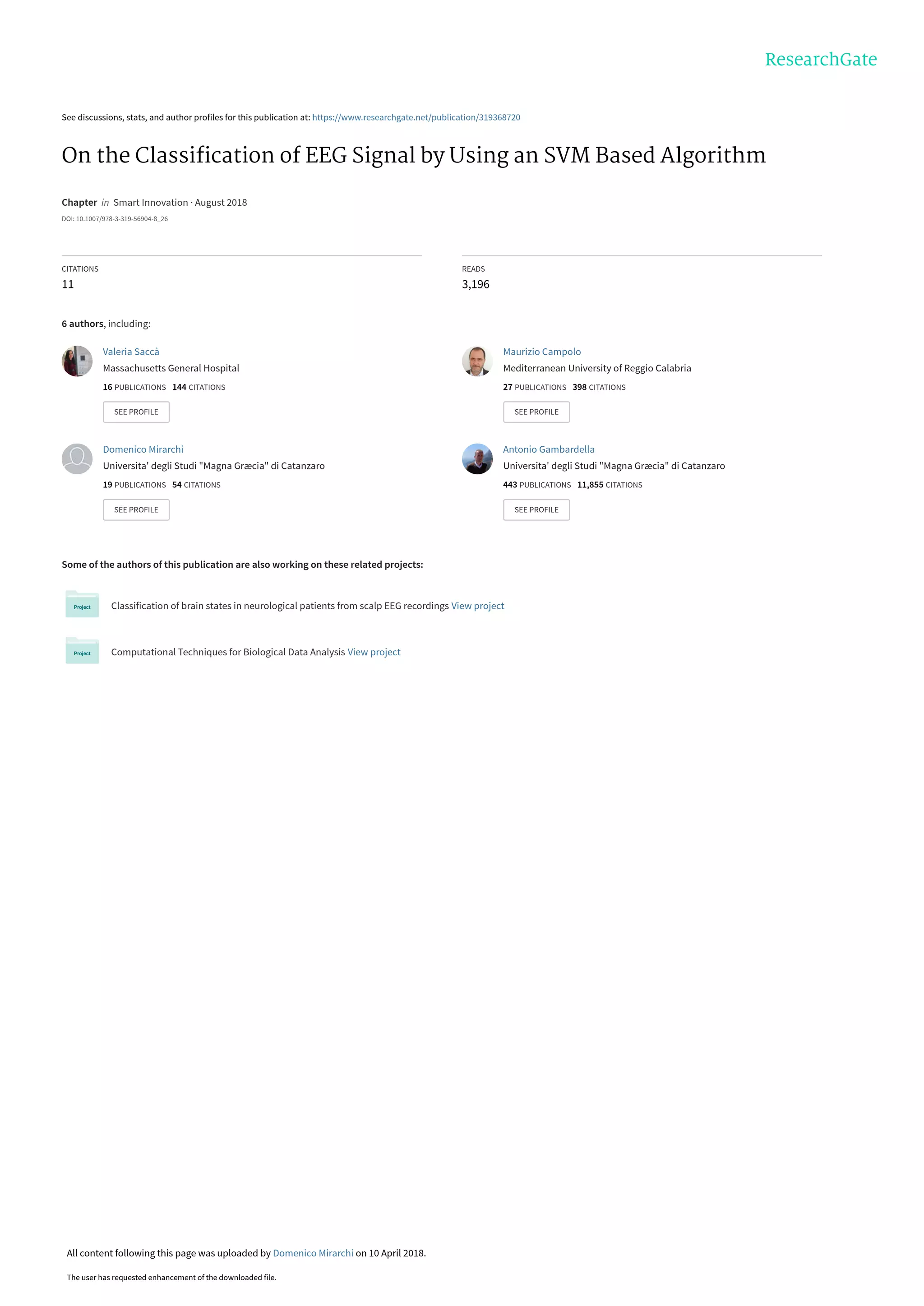 The document discusses the use of a support vector machine (SVM) based algorithm for classifying EEG signals, particularly in the context of Creutzfeldt-Jakob disease (CJD). It emphasizes the significance of accurate classification methods in diagnosing brain disorders and details the preprocessing, feature extraction, and classification techniques used to achieve an impressive accuracy of 96.67%. The study highlights the challenges of EEG signal analysis due to noise and dimensionality while providing a systematic approach for improving diagnosis through data reduction and machine learning techniques.