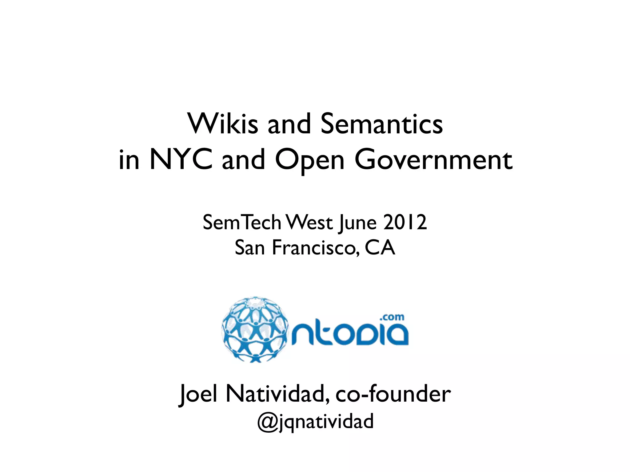 The document discusses wikis and semantics in New York City and open government. It covers Joel Natividad's presentation on CrowdKnowing, a human-powered and machine-accelerated collective knowledge system, and its application to smart cities through a brand called Ontodia. The rest of the document discusses open data in New York City, including a bill requiring public data sets to be made available online, and why NYC is a good location for open data and smart city applications due to its large population, economy, and emphasis on public-private partnerships.