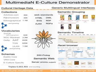 The document discusses the principles and technologies for developing ontologies in a semantic culture web, highlighting the importance of standardization, scale, and interdisciplinary approaches. It emphasizes the need for ontology engineers to utilize existing vocabularies, avoid idiosyncratic developments, and focus on pattern-based methodologies to enhance knowledge sharing. Additionally, it addresses challenges in integrating different data types, suggesting solutions such as natural language processing and image analysis to improve search capabilities in multimedia archives.