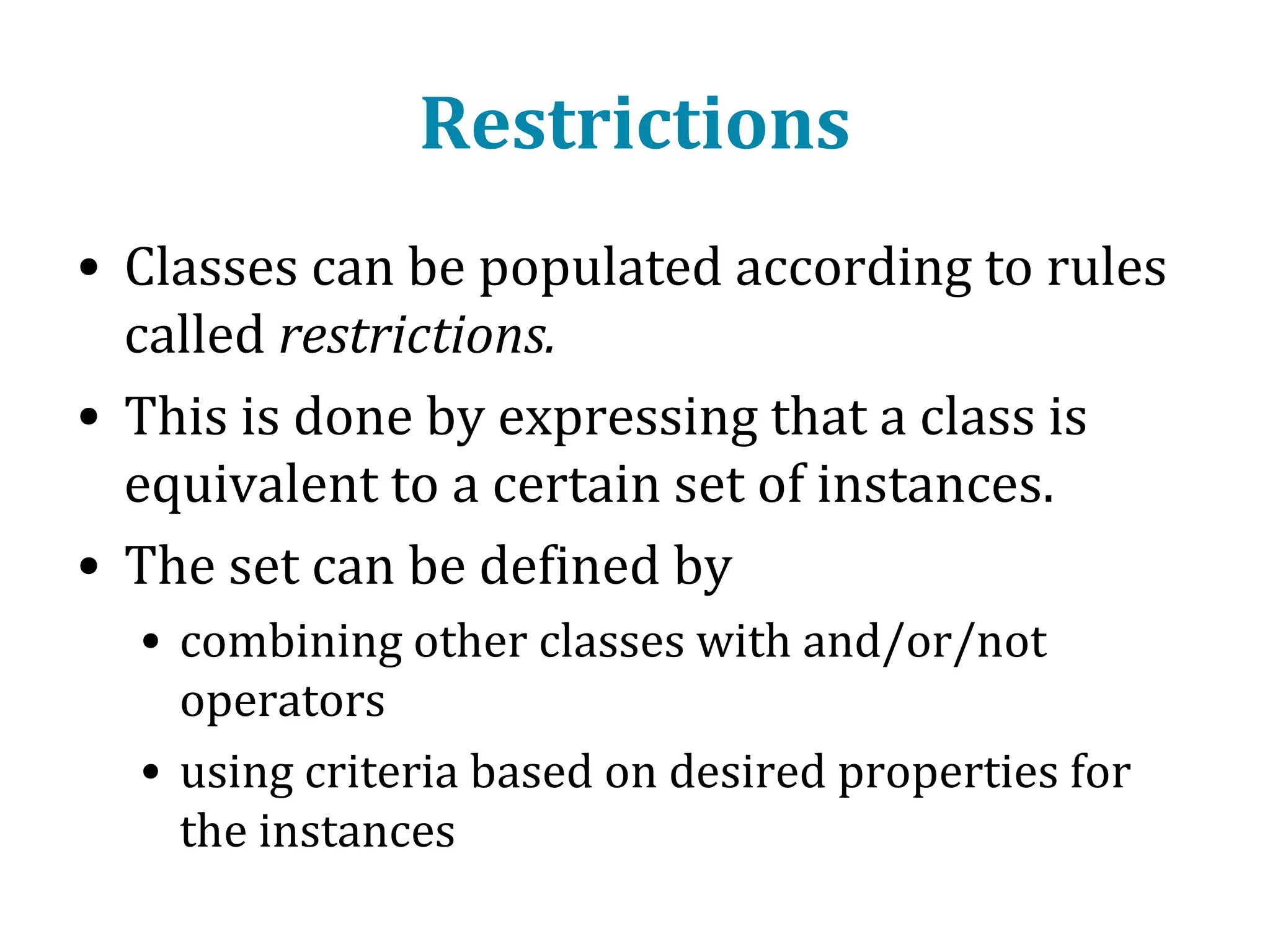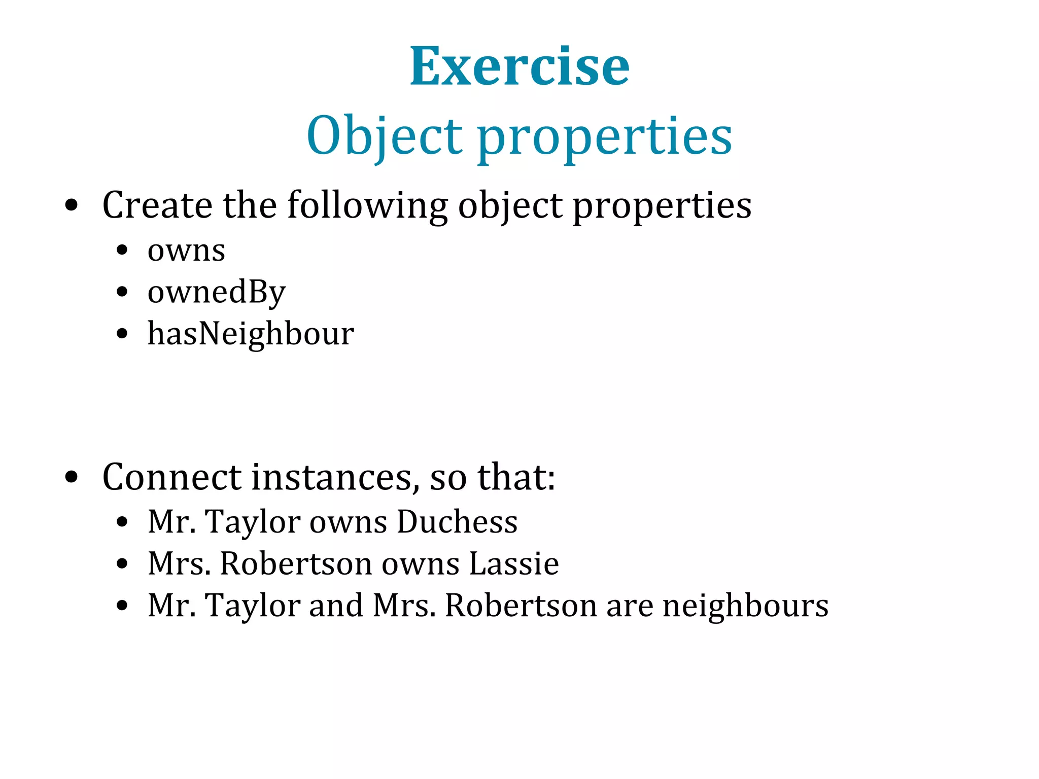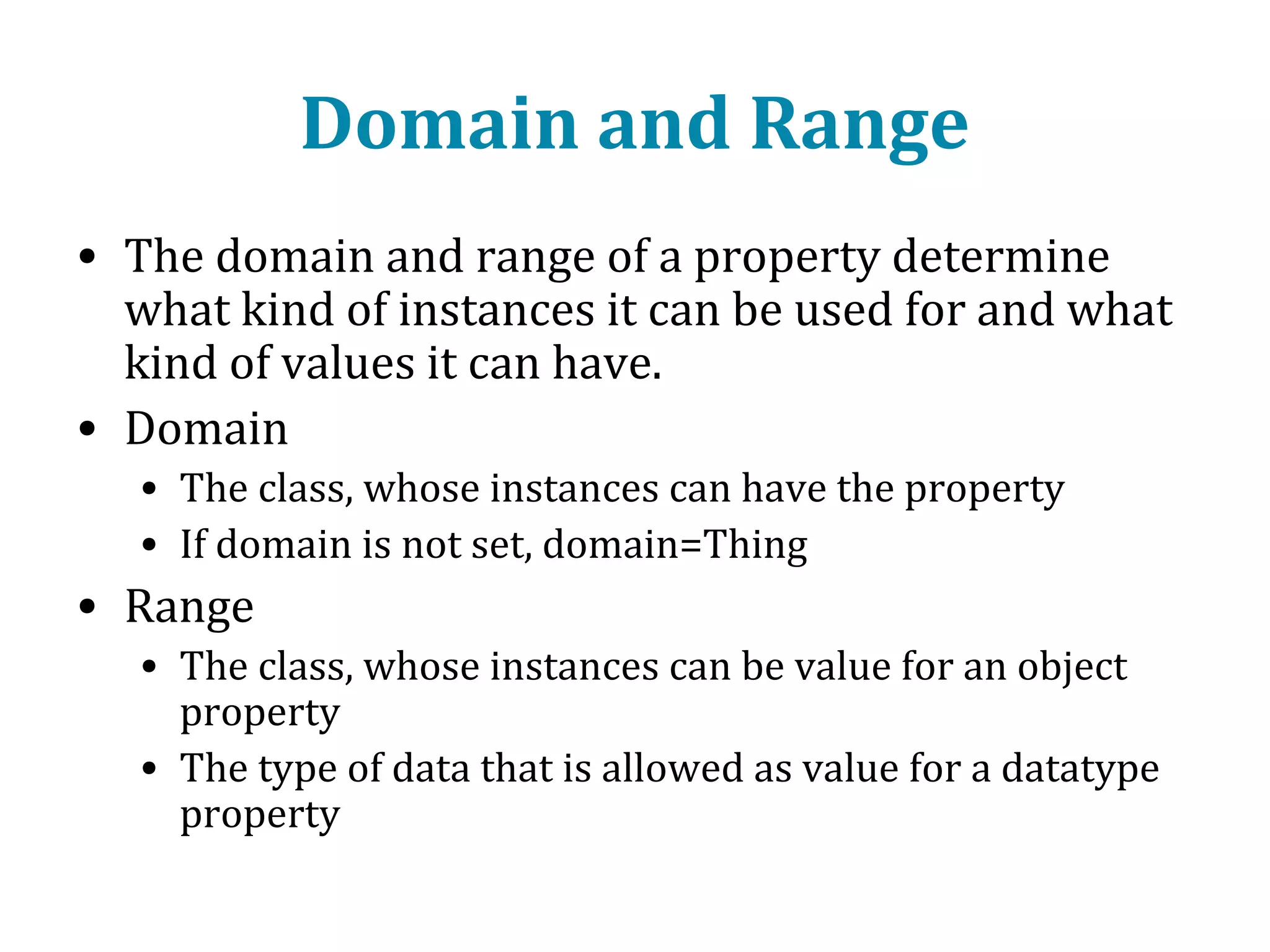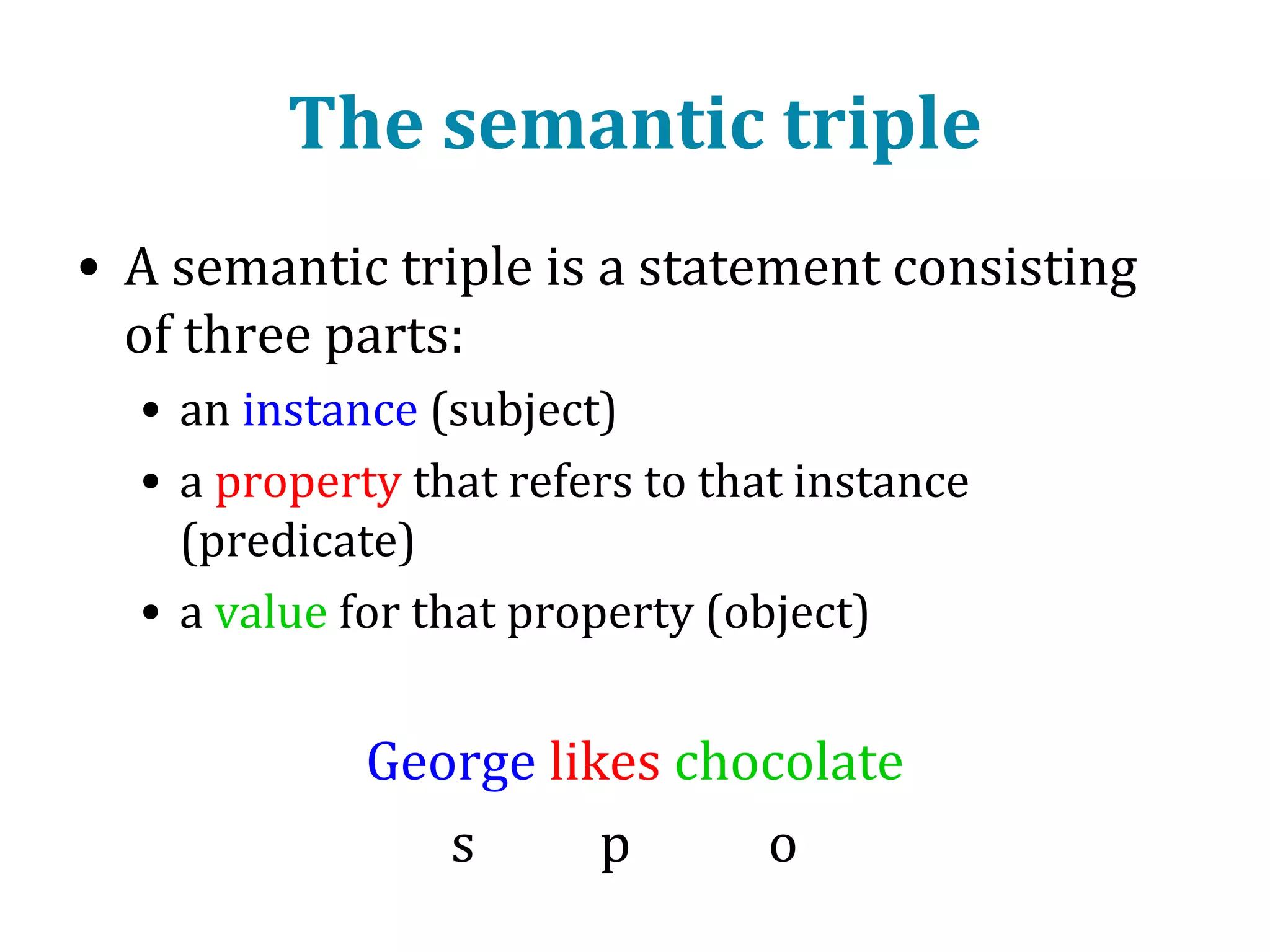 This document provides an introduction to ontology modeling and the semantic web. It defines key concepts such as semantics, ontology, taxonomy, classes, properties, and restrictions. It explains how ontologies can formally represent knowledge through semantic triples that connect instances, classes, and properties. Examples are provided to demonstrate how to construct a simple ontology in Protege that defines classes, subclasses, individuals, and object and datatype properties between them. The document also discusses important ontology modeling principles like the open world assumption.