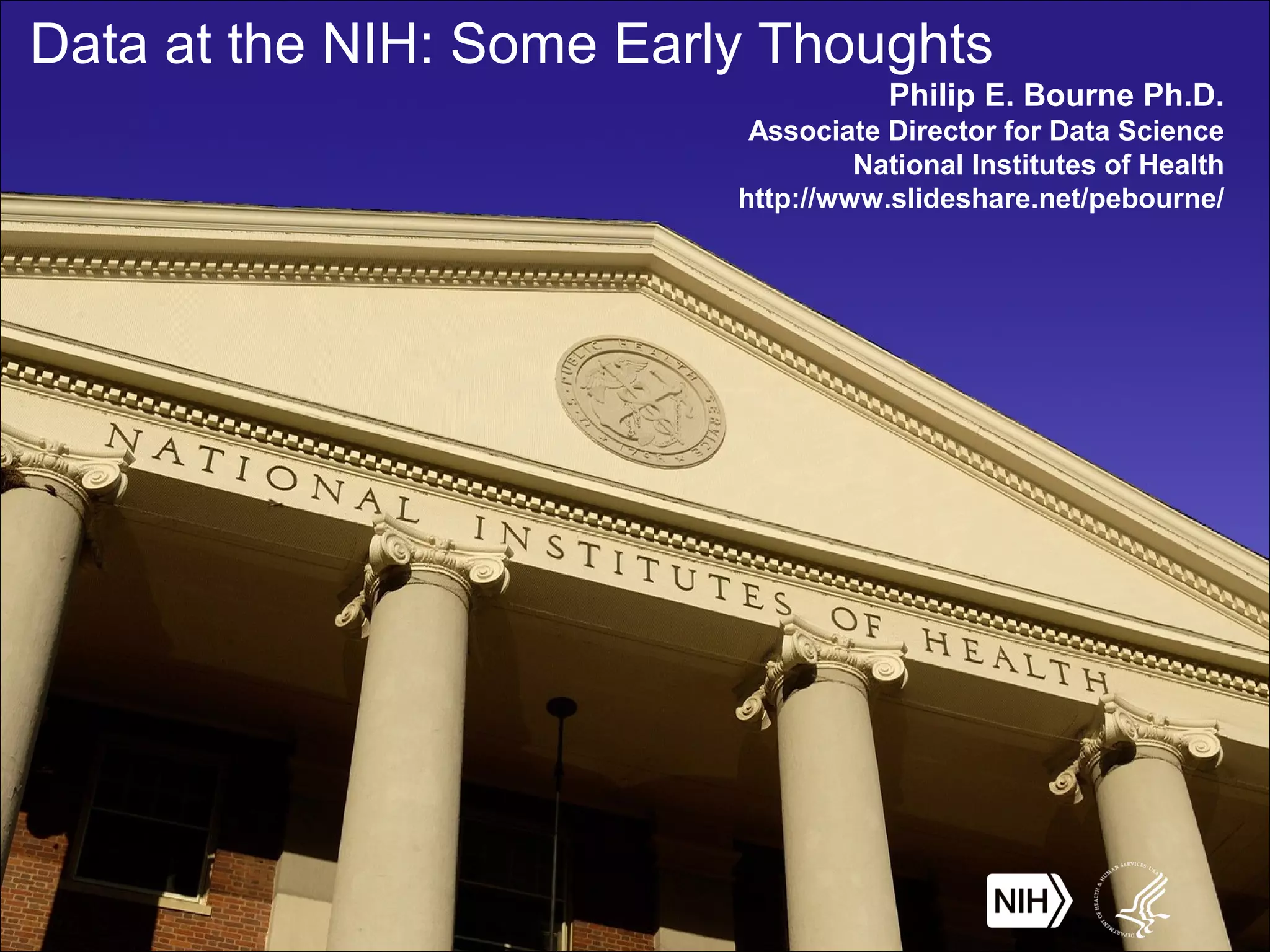 This document provides an overview of Philip Bourne's early observations and thoughts regarding data management at the NIH. Some of the key points are: 1) Existing data resources are not well understood in terms of how they are used; 2) There is a need to focus on how data will be managed and shared, not just why it should be; 3) There is no NIH-wide sustainability plan for data management; 4) Training in biomedical data science is inconsistent. The document discusses some potential solutions such as establishing a NIH data commons and improving training programs.