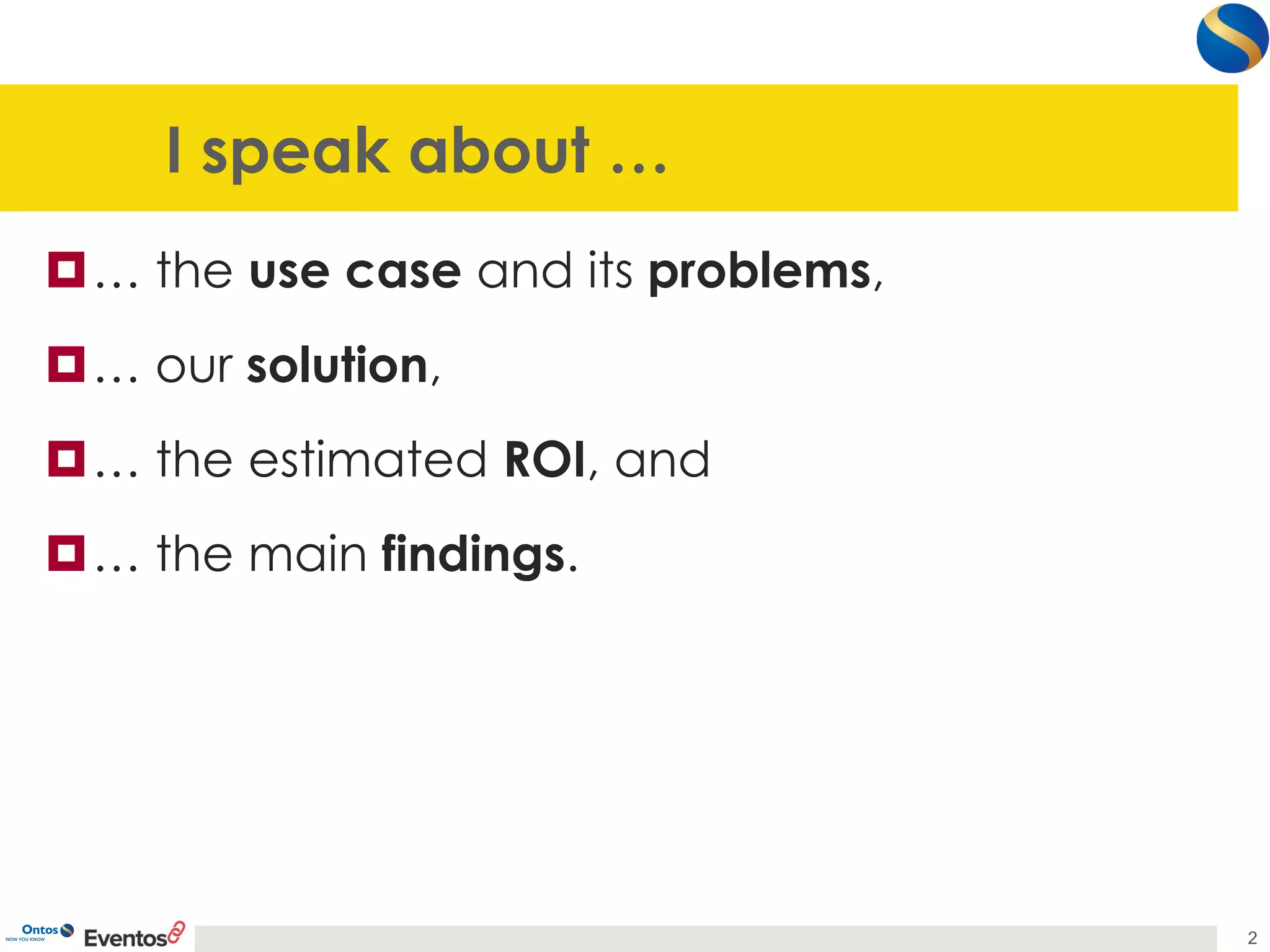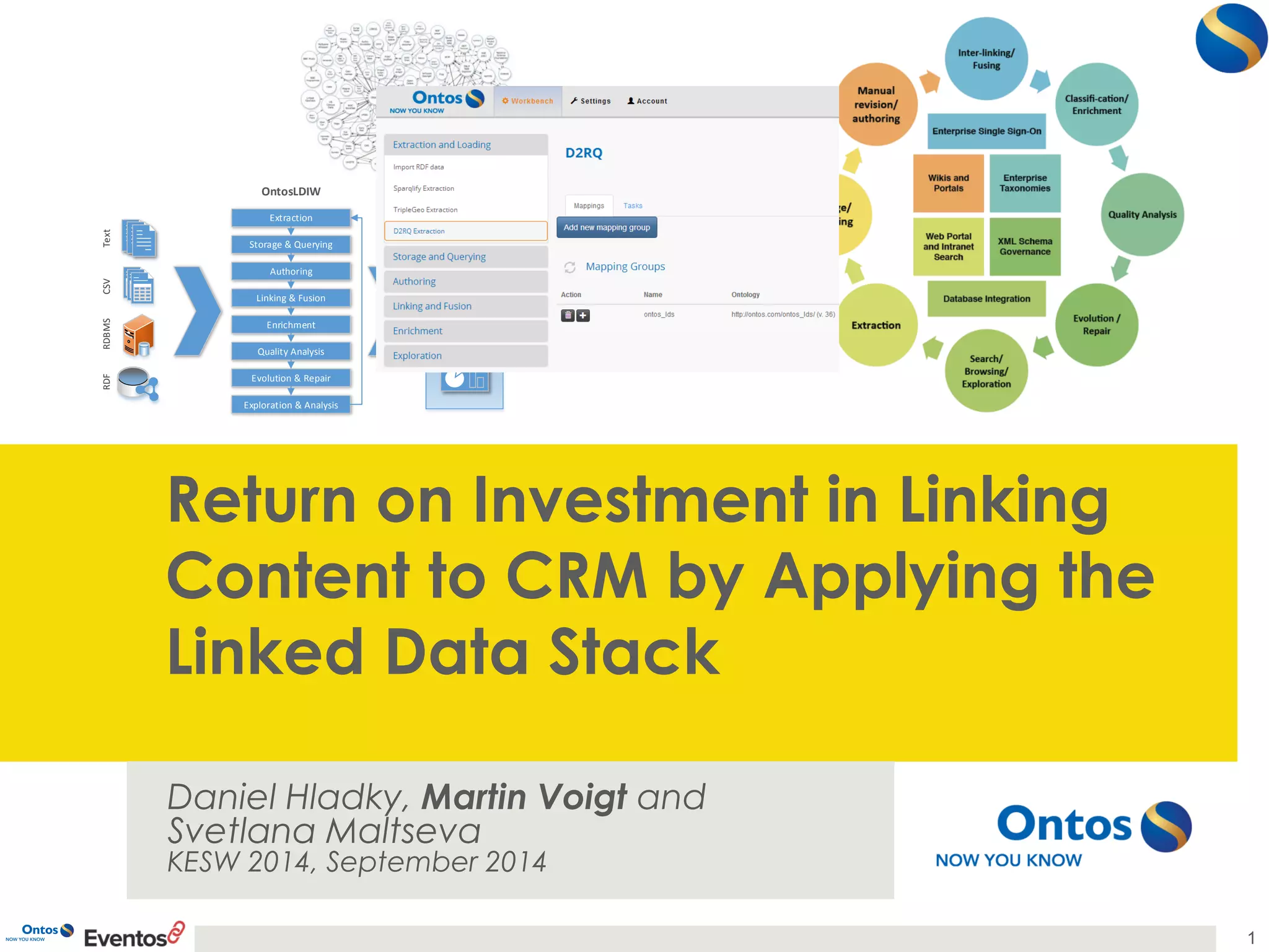 The document discusses the integration of linked data in customer relationship management (CRM) systems, identifying challenges and presenting a solution through the Ontos Linked Data Information Workbench. It highlights that integrating linked data can lead to significant time and cost efficiencies, with a projected ROI of 186% over three years. The findings underscore the need for better understanding of semantic web technologies within enterprises to optimize these benefits.