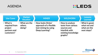 The document discusses a project on streaming-based text mining using deep learning and semantic technologies, focusing on its use cases, market situation, and implementation details. Key areas include content augmentation in e-commerce, crime investigation assistance, and entity recognition from various data sources. The report also highlights lessons learned, including the importance of deep learning skills and the integration of semantic web technologies for data processing.