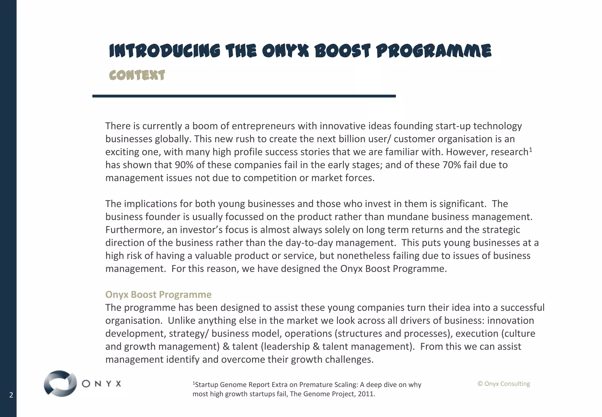 The Onyx Boost Programme is designed to support early-stage technology startups in overcoming management challenges that contribute to high failure rates. By focusing on key areas like innovation, strategy, operations, and talent management, the programme provides tailored assessments and ongoing support to help companies realize their growth potential. The initiative also offers investors insights into risks and opportunities across their portfolio companies, thus aiding in strategic decision-making.