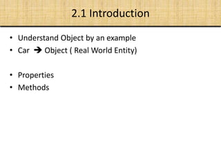 This document discusses object-oriented concepts including identity, classification, inheritance, polymorphism, and abstraction. It defines these concepts and provides examples. Identity refers to each object having its own identity even if attribute values are identical. Classification groups objects of the same structure and behavior into classes. Inheritance allows classes to inherit attributes and behaviors from superclasses. Polymorphism allows the same operation to have different implementations for different classes. Abstraction focuses on essential aspects and ignores non-essential details. The document also discusses class, state, and interaction models for describing different views of a system.