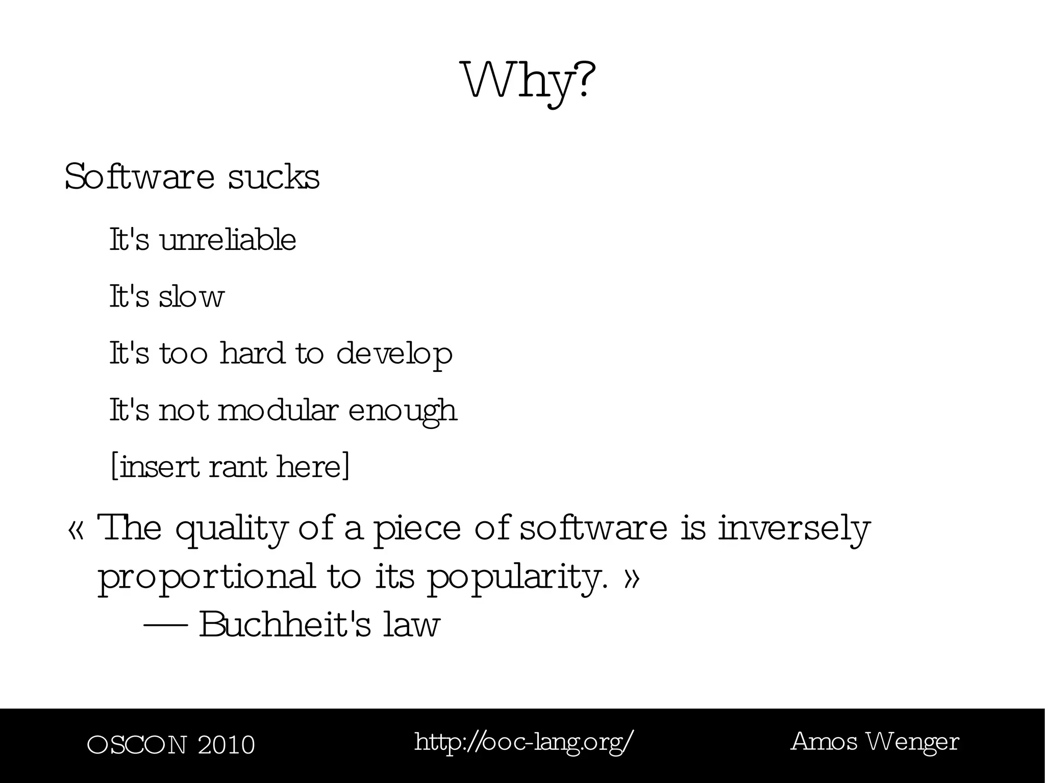The document discusses the limitations and frustrations of current programming languages and tools, proposing a new hybrid language called ooc aimed at improving software development experiences. It emphasizes modular design, ease of use, and innovative features like garbage collection and generic programming, while critiquing existing approaches to software architecture. The document concludes with a vision for ongoing improvements and the broader community engagement around the ooc language.