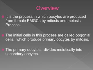 Oogenesis is the process by which oocytes are produced from primordial germ cells in females. It involves mitosis and meiosis. Primordial germ cells undergo mitosis to form primary oocytes, which then enter meiosis. During meiosis, primary oocytes become haploid secondary oocytes or polar bodies which later dissolve. Secondary oocytes may further divide into mature eggs or more polar bodies. Thus, oogenesis involves cell division and growth to form mature eggs for reproduction in females.