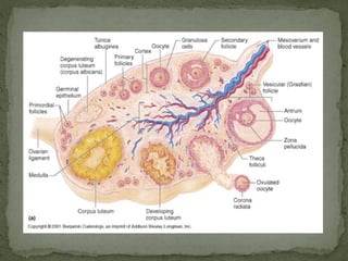 Oogenesis is the process of growth and maturation of the female gametes in the ovaries, involving primordial germ cells that develop into primary and secondary oocytes through various stages including previtellogenesis and vitellogenesis. The growth phase is characterized by significant cellular changes, including the accumulation of yolk and organelles like mitochondria, and the formation of lampbrush chromosomes which enhance protein production. Different types of yolk, based on composition and distribution, are crucial for nourishing embryos, with variations observed across species.