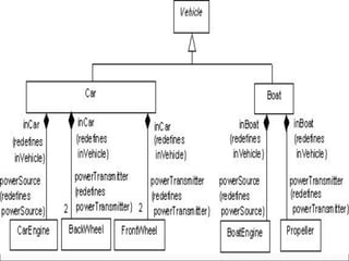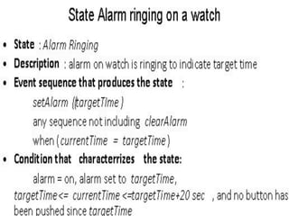 This document provides an overview of object-oriented modeling and design concepts, including advanced class modeling techniques, state modeling, and practical tips. It discusses advanced class concepts such as association ends, n-ary associations, aggregation, abstract classes, multiple inheritance, metadata, reification, constraints, and derived data. It also covers state modeling concepts like events, states, transitions, and conditions, and how to model these using state diagrams. Examples are provided to illustrate enumeration, scope, visibility, packages, and a state diagram for a phone line.