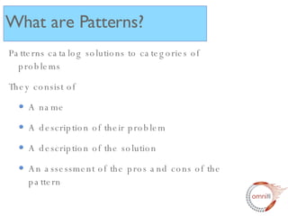 The document discusses object-oriented programming (OOP) principles and design patterns in PHP, explaining key OOP concepts like encapsulation, inheritance, and polymorphism. Several common design patterns are described, including singleton, factory, observer, and proxy patterns, and how they can help solve recurring problems by promoting code reuse. The document provides examples of applying these patterns in PHP code to handle issues like object aggregation, iteration, and dynamic method dispatching.