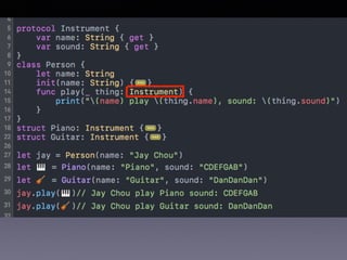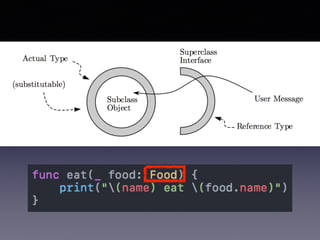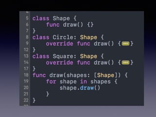 This document discusses polymorphism and object-oriented programming principles in Swift. It defines polymorphism as an object being able to take on multiple forms. Polymorphism in Swift can be achieved through class inheritance and protocol interfaces. The document also discusses the open-closed principle, which states that code should be open for extension but closed for modification. Finally, it explains the Liskov substitution principle, which requires that subclasses behave exactly like their parent classes so the subclasses can be substituted for their parents without altering behavior.