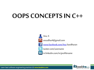 This document discusses object-oriented programming concepts in C++ including data abstraction, inheritance, encapsulation, and polymorphism. It provides examples of classes, objects, and methods to illustrate these concepts. Specifically, it defines a class called CS to represent students with properties like ID and marks, and a method to calculate average. It also shows an example using an Item class to store item numbers and prices in an array to demonstrate encapsulation. The document concludes with contact details for the training organization that created the presentation.