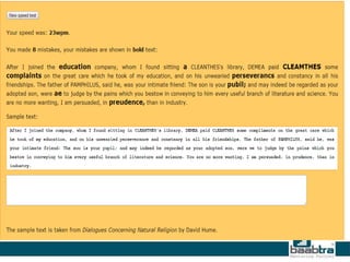 This document summarizes a mentee's progress in their typing skills and learning of object-oriented programming concepts over 10 weeks. It shows that the mentee's typing speed improved from 18WPM to 23WPM but did not reach the weekly target of 25WPM. It then explains key OOP concepts like classes, objects, constructors, abstraction, encapsulation, polymorphism, and inheritance. It provides examples to illustrate these concepts. The document was prepared by trainees of Baabtra as part of their mentoring program.