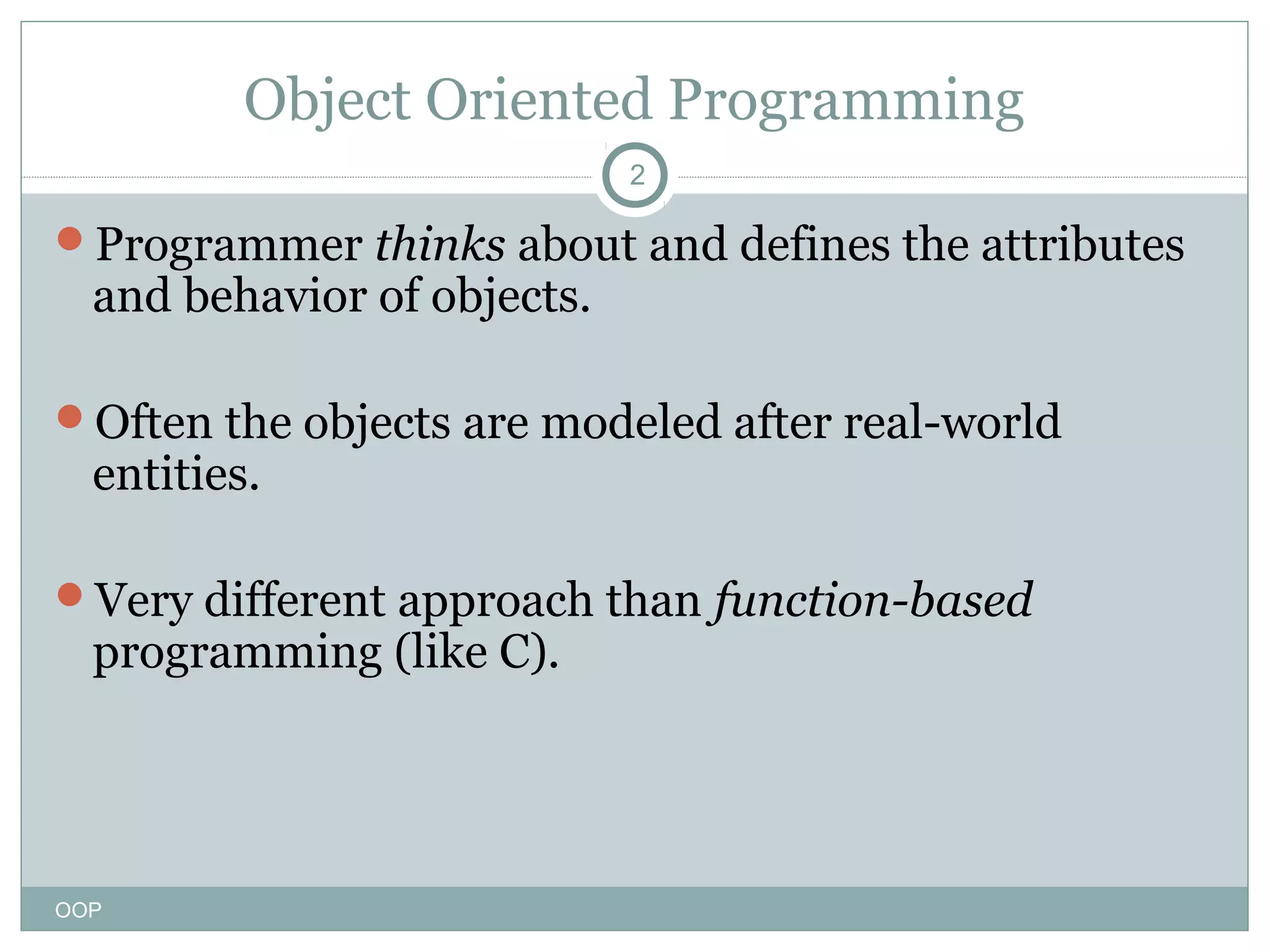 The document discusses object-oriented programming and C++ classes. It defines classes as user-defined types that encapsulate data and functions. Classes allow for abstraction, encapsulation, inheritance, and polymorphism. A class defines data members and member functions. Data members can be private or public, and member functions are typically public to allow external access. The document provides an example C++ class for a gradebook that defines a displayMessage member function. It also shows how to create an object of the class and call the member function.