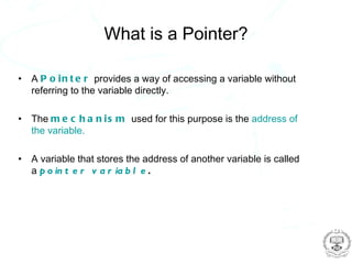 This document provides an overview of pointers in C++. It defines what a pointer is, how to declare pointer variables, and how to dereference pointers using the indirection operator. It discusses how to get the address of a variable using the address of operator and how to assign that address to a pointer variable. The document also covers pointer arithmetic, passing pointers as function parameters, dynamic memory allocation using new and delete, and the differences between pointers and references.