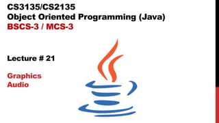 This document discusses graphics and audio in Java. It lists several methods of the java.awt.Graphics class for drawing shapes, text, and clearing areas, including drawString(), drawLine(), drawRect(), fillRect(), drawRoundRect(), fillRoundRect(), drawOval(), fillOval(), and clearRect(). These methods define parameters for the position and dimension of the shapes, text, and areas. The document is part of a lecture on object oriented programming in Java.