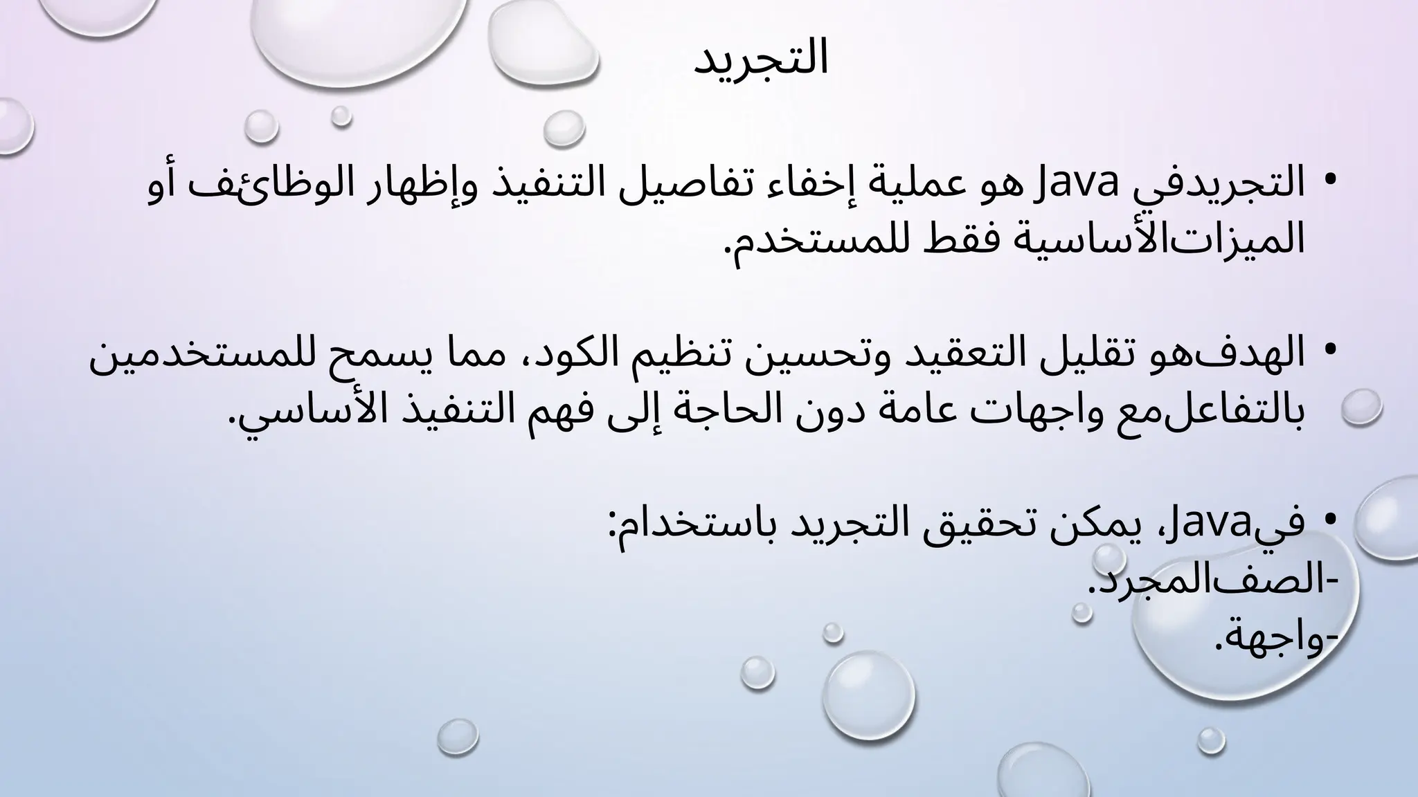 ﺍﻟﺘﺠﺮﻳﺪ • ﺍﻟﺘﺠﺮﻳﺪ ﻓﻲ Java ﻫﻮ ﻋﻤﻠﻴﺔ ﺇﺧﻔﺎء ﺗﻔﺎﺻﻴﻞ ﺍﻟﺘﻨﻔﻴﺬ ﻭﺇﻇﻬﺎﺭ ﺍﻟﻮﻇﺎﺉﻒ ﺃﻭ ﺍﻟﻤﻴﺰﺍﺕ ﺍﻷﺳﺎﺳﻴﺔ ﻓﻘﻂ .ﻟﻠﻤﺴﺘﺨﺪﻡ • ﺍﻟﻬﺪﻑ ﻫﻮ ﺗﻘﻠﻴﻞ ﺍﻟﺘﻌﻘﻴﺪ ﻭﺗﺤﺴﻴﻦ ﺗﻨﻈﻴﻢ ،ﺍﻟﻜﻮﺩ ﻣﻤﺎ ﻳﺴﻤﺢ ﻟﻠﻤﺴﺘﺨﺪﻣﻴﻦ ﺑﺎﻟﺘﻔﺎﻋﻞ ﻣﻊ ﻭﺍﺟﻬﺎﺕ ﻋﺎﻣﺔ ﺩﻭﻥ ﺍﻟﺤﺎﺟﺔ ﺇﻟﻰ ﻓﻬﻢ ﺍﻟﺘﻨﻔﻴﺬ .ﺍﻷﺳﺎﺳﻲ • ﻓﻲ Java ، ﻳﻤﻜﻦ ﺗﺤﻘﻴﻖ ﺍﻟﺘﺠﺮﻳﺪ :ﺑﺎﺳﺘﺨﺪﺍﻡ ﺍﻟﺼﻒ- .ﺍﻟﻤﺠﺮﺩ - .ﻭﺍﺟﻬﺔ