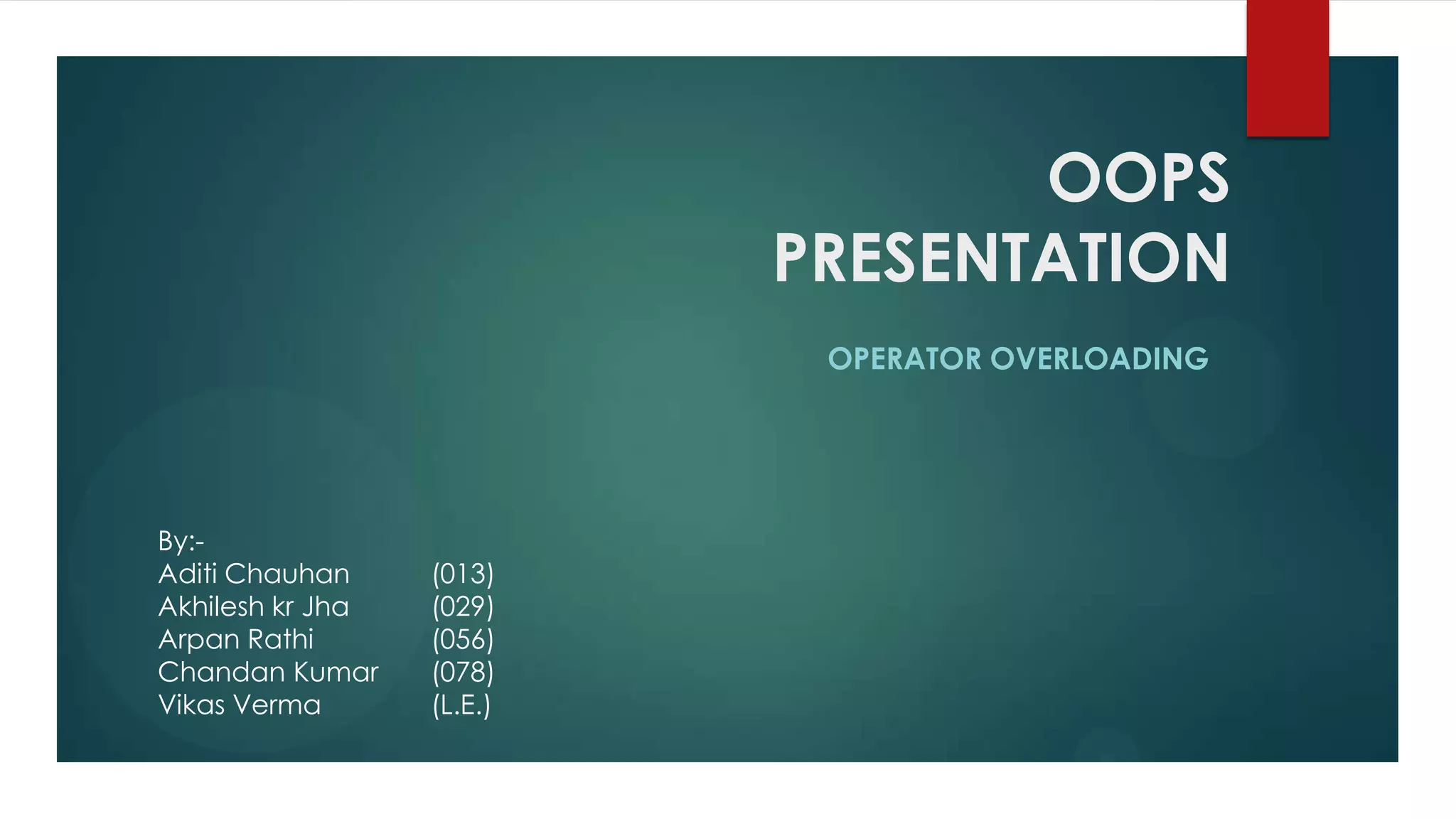 Operator overloading allows normal C++ operators like + and - to have additional meanings when used with user-defined types. It makes statements more intuitive, for example writing d2 = d1 + 45 instead of d2.add_days(d1, 45). Operators can be overloaded by defining operator functions that specify their behavior for a class. Only certain operators can be overloaded, and their syntax and semantics must be preserved.