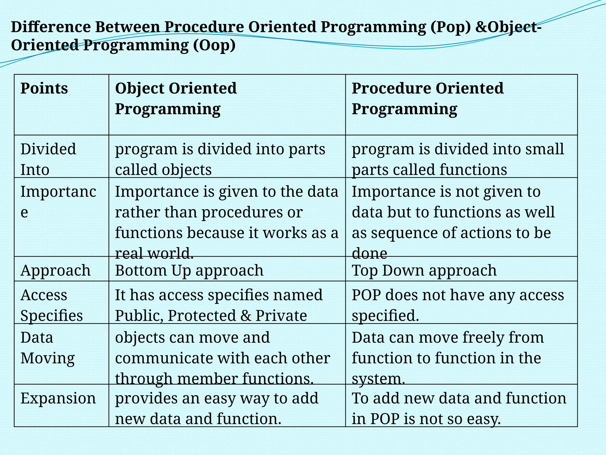 The document outlines the differences between Procedure Oriented Programming (POP) and Object Oriented Programming (OOP), highlighting aspects like program structure, data handling, and expansion capabilities. OOP emphasizes data over procedures, offering advantages such as enhanced software reuse, security, and better performance, while POP focuses on functions and global data access. It also discusses merits and demerits of OOP, such as the need for proper planning and design, potential for larger program sizes, and difficulties in converting real-world problems into an object-oriented model.