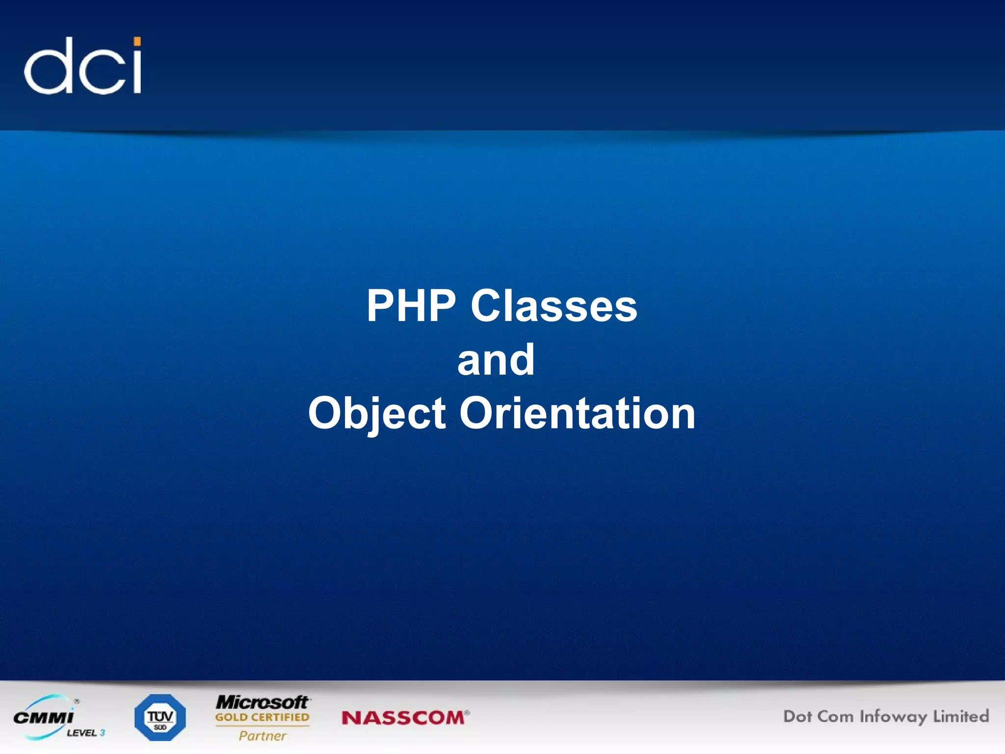 This document provides an overview of PHP classes and object-oriented programming. It defines what a class is conceptually and how to define a class in PHP, including defining attributes and methods. It explains how to instantiate class objects and use their methods. The document also covers class inheritance, constructors, and the differences between PHP4 and PHP5 object models.