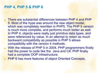 PHP supports both procedural and object-oriented programming. The document discusses the differences between PHP 4 and PHP 5, with PHP 5 introducing substantial improvements to PHP's object model. It then outlines 22 steps for developing an object-oriented PHP application, covering key OOP concepts like classes, objects, properties, methods, constructors, access modifiers, inheritance, and method overriding.