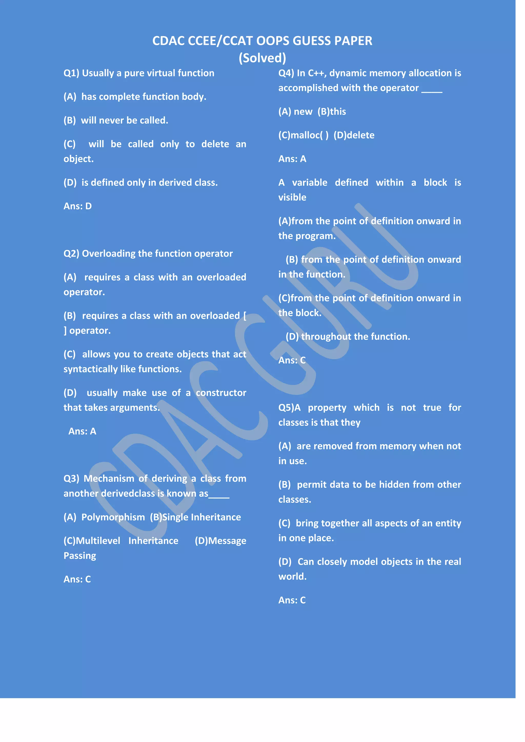 The document is a collection of C++ programming questions and answers focusing on object-oriented programming concepts such as pure virtual functions, inheritance, and operator overloading. It addresses various characteristics of classes, memory management, and the visibility of variables in different scopes. The answers provided clarify key programming principles related to these topics.