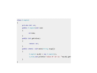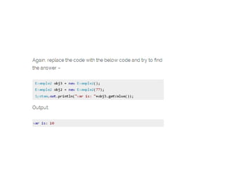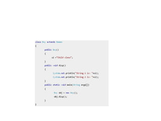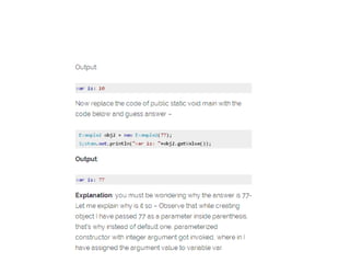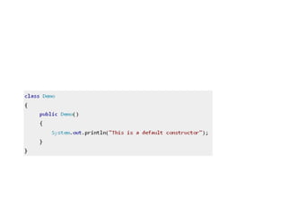 The document provides an introduction to constructors in Java programming, explaining their purpose, types, and how to call them. It details the differences between default and parameterized constructors, constructor chaining, and important points regarding access specifiers and inheritance. Additionally, it clarifies misconceptions regarding constructor existence and functionality within objects and classes.