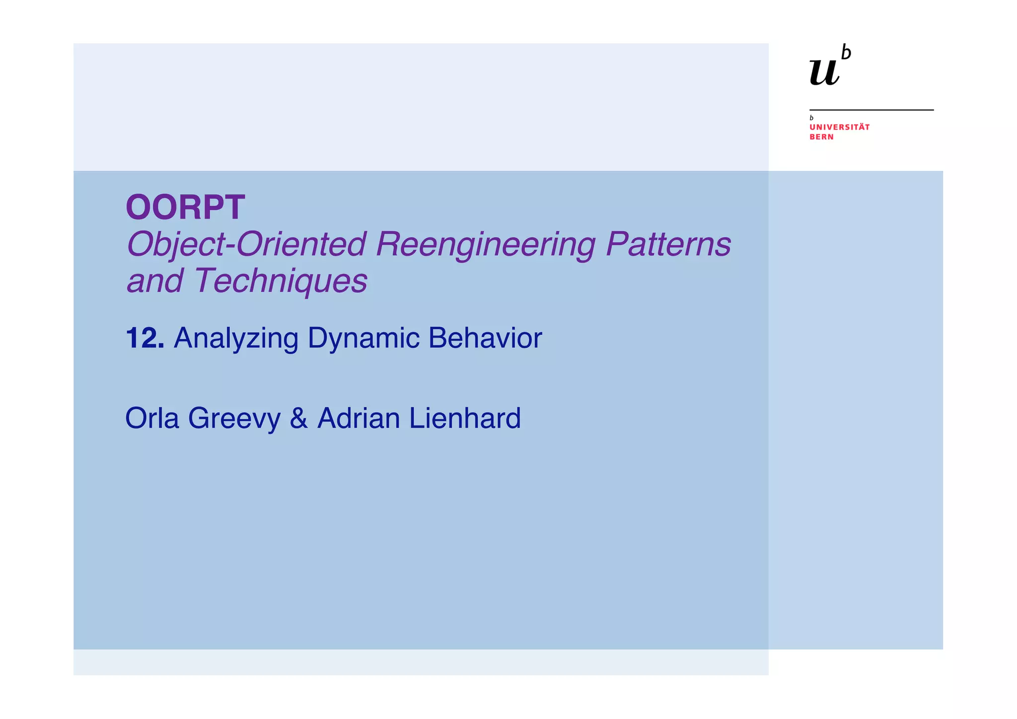 This document discusses dynamic analysis techniques for understanding the runtime behavior of object-oriented programs. It describes various sources of runtime information, such as program output, resource usage, and internal instrumentation. Common tools for dynamic analysis include loggers, debuggers, and profilers. Reverse engineering techniques can combine static and dynamic views. Feature-based analysis aims to map features to source code by comparing execution traces.
