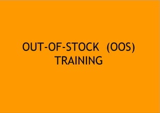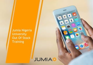 The document provides training on out-of-stock (OOS) issues for Jumia vendors. It defines OOS, explains Jumia's shipping and order fulfillment processes, and identifies common causes of OOS like lack of inventory, incorrect pricing, and delays. The effects of OOS on a vendor's business are outlined, including lost sales, fines, and potential delisting. Solutions to avoid OOS are presented, such as proper inventory tracking, scheduling fulfillment, and escalating errors.