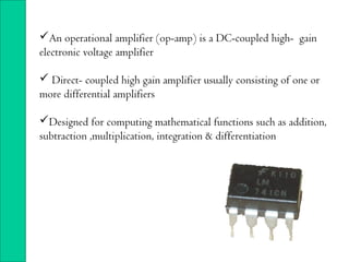 Operational amplifiers (op-amps) are high-gain electronic voltage amplifiers used for mathematical computations. They have differential inputs that amplify the difference between the voltages and provide an output proportional to that difference. Op-amps aim to have infinite gain, infinite input impedance, zero output impedance, and other ideal characteristics. They are made up of stages like input, intermediate, level shifting, and output stages. Common applications include audio amplification, instrumentation, and analog computing.