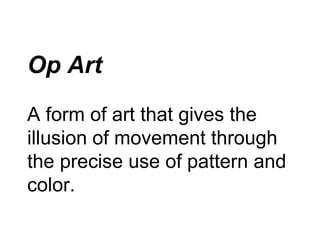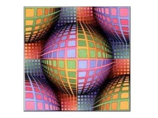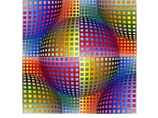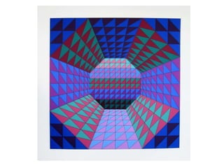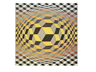 Victor Vasarely was a French painter considered one of the first Op Art artists, exploring optical illusions through precise patterns and colors that gave the illusion of movement. As a commercial artist and graphic designer, he first experimented with black and white works before incorporating color to make parts of his geometric images seem to bulge or vibrate against their backgrounds. Vasarely's paintings and graphics reached their peak popularity and influence in the 1960s and 1970s as Op Art rose in the United States and Europe.