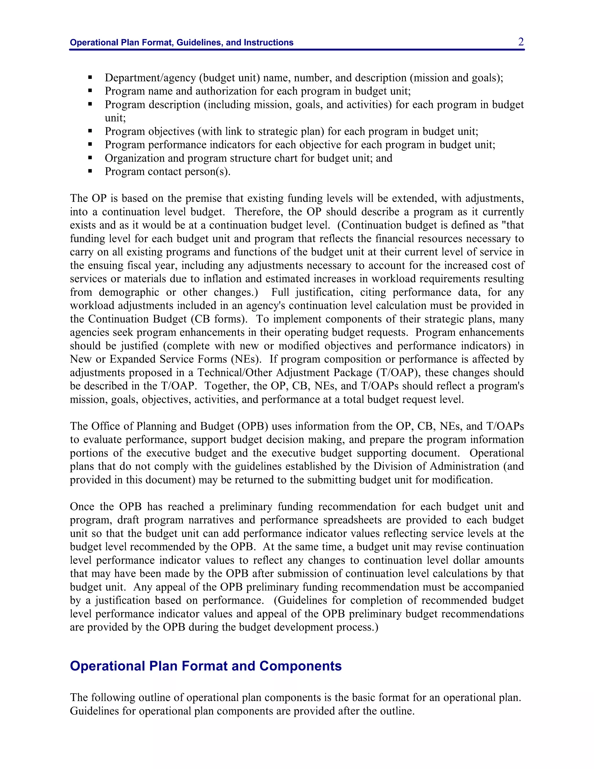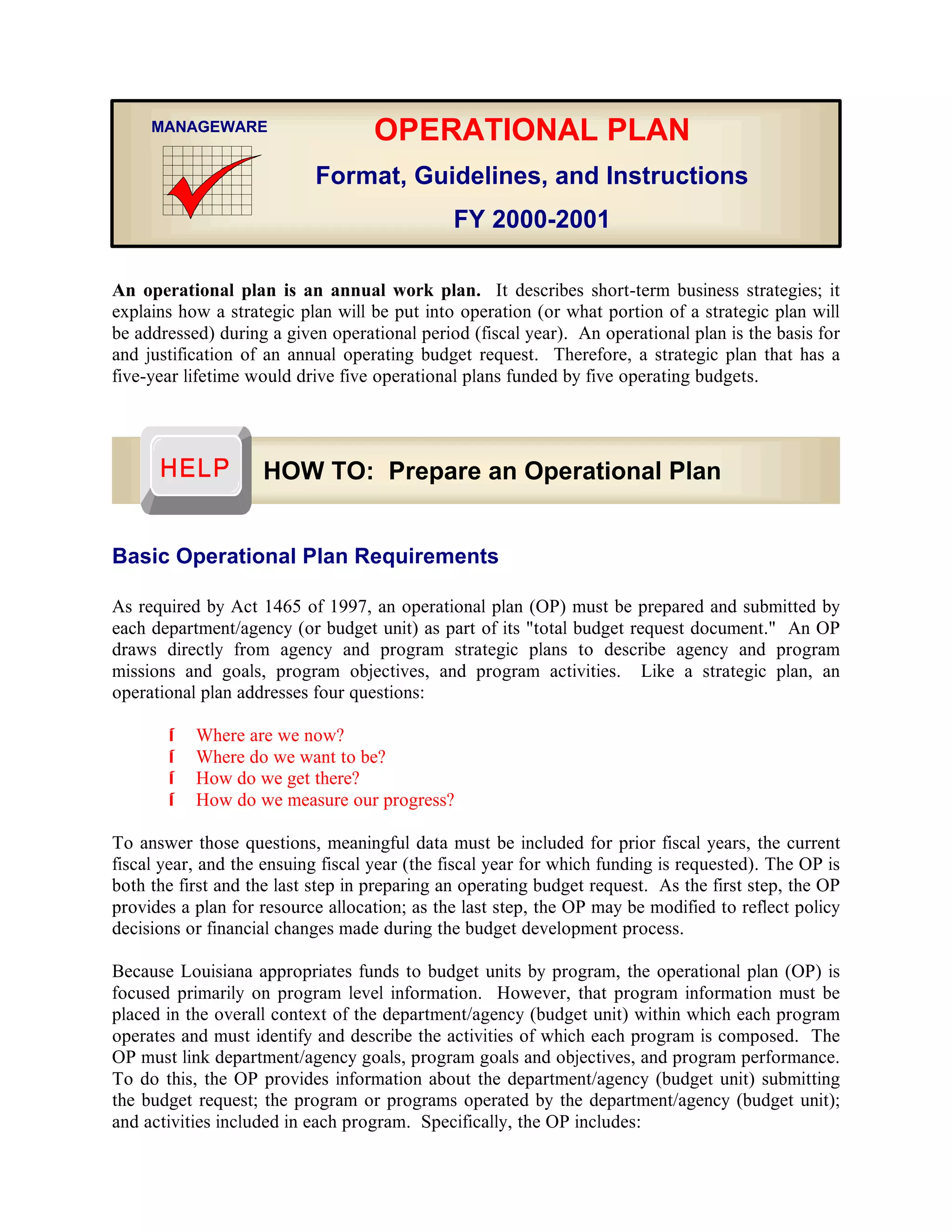 An operational plan is a short-term annual work plan that describes how a department or agency will implement its strategic plan over a one-year period. It explains the strategies, goals, and activities that will be undertaken to advance the strategic plan during the upcoming fiscal year. The operational plan forms the basis for an annual budget request and justifies the funding needed to carry out the planned activities. Departments submit operational plans as part of their annual budget requests to receive funding to implement the plans.