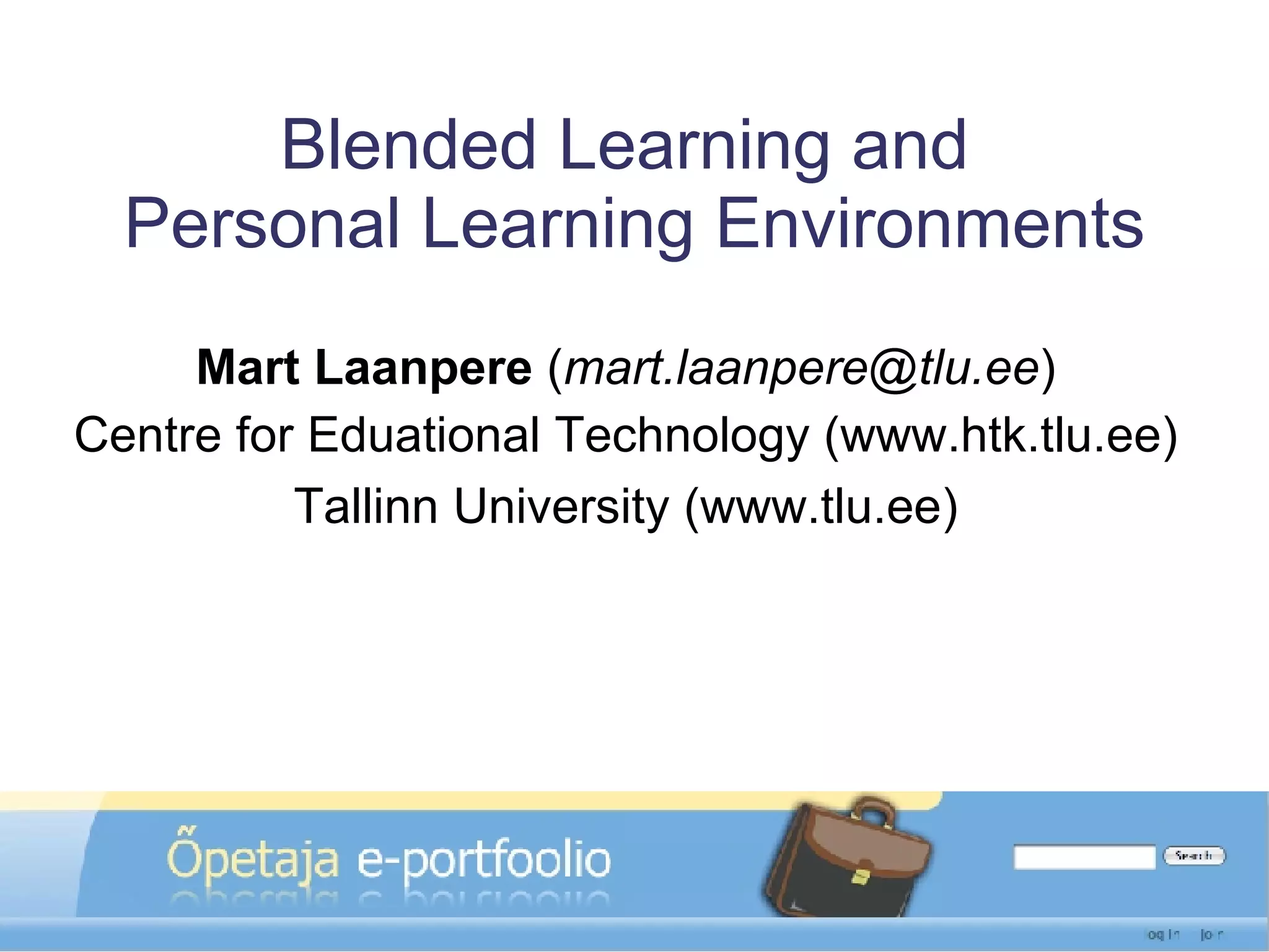 The document discusses blended learning and personal learning environments. It defines blended learning as combining different delivery modes, teaching models, technologies, and learning styles. It also discusses the concepts of managed learning environments, ecological constructivist learning environments, and personal learning environments (PLEs). PLEs allow for knowledge construction through authentic contexts, collaboration, and a focus on designing learning environments that balance these three components.