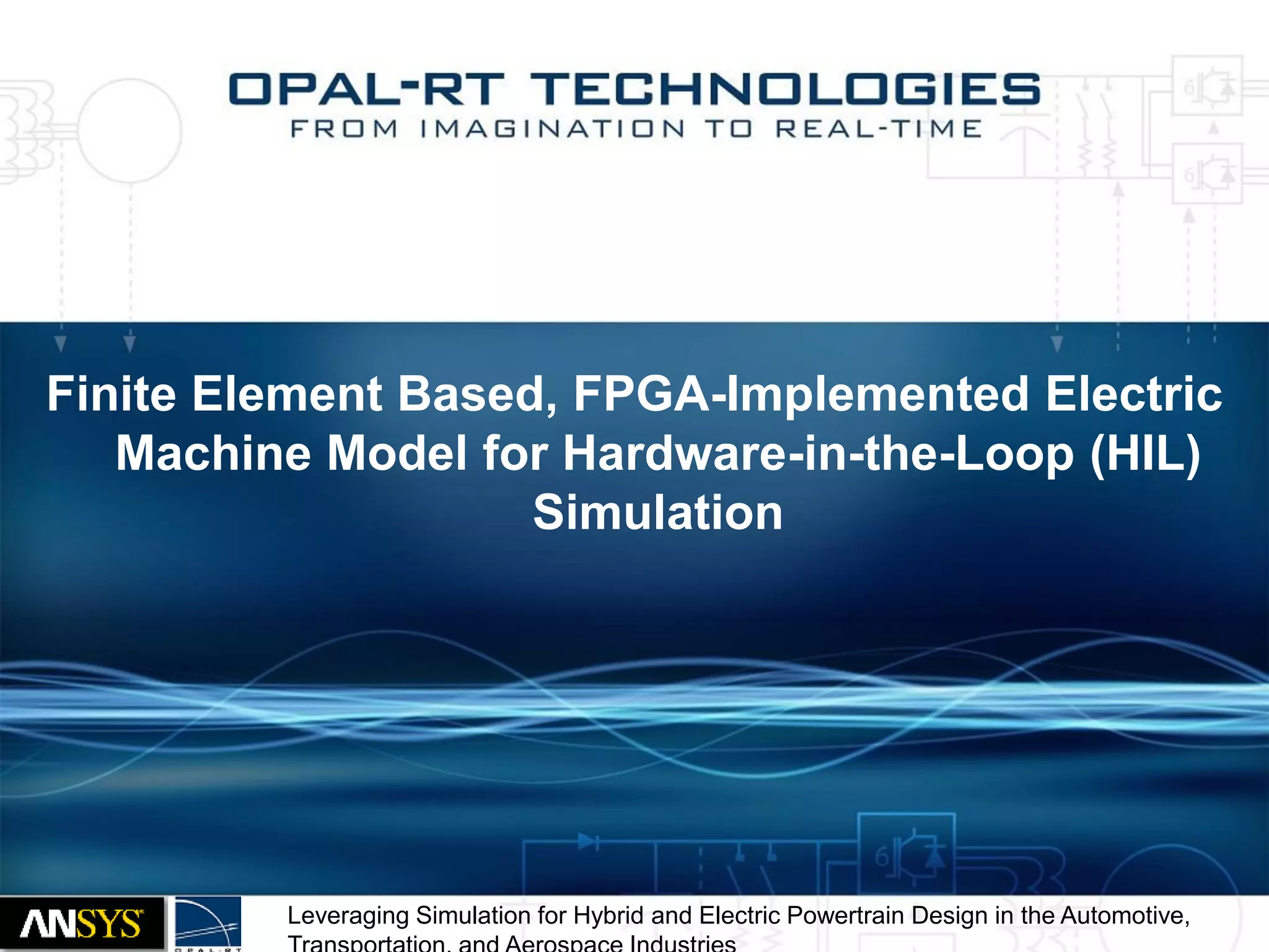 This document discusses using FPGAs for hardware-in-the-loop simulation of electric machines. It begins with an introduction to HIL simulation and why FPGAs are advantageous compared to CPUs for modeling electric drives. It then describes implementing a permanent magnet synchronous motor solver on an FPGA for high-fidelity, high-speed modeling. The document shows how FEA models from ANSYS Maxwell can be exported and integrated with I/O interfaces on an FPGA-based real-time simulator from OPAL-RT to perform HIL simulation. Benchmark simulations of a Prius motor model exported from Maxwell and run on an OPAL-RT system demonstrate the benefits of using FPGAs for electric machine HIL modeling.