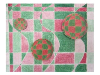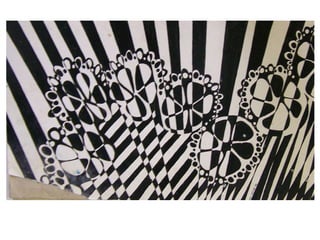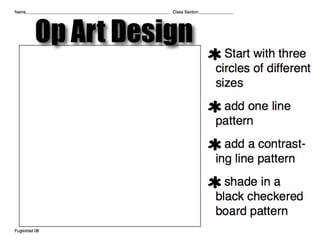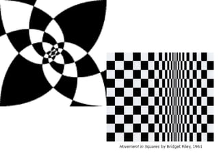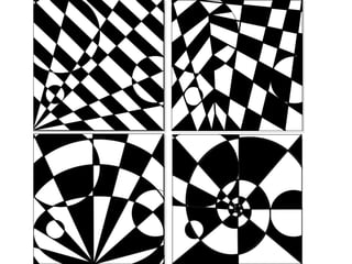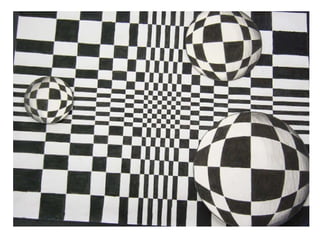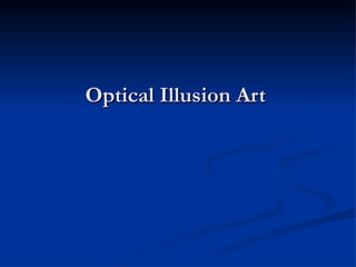 The document discusses optical illusions and an art project assigning students to create their own optical illusion drawings. It defines an optical illusion as something that deceives the human visual system into perceiving something that is not present or incorrectly perceiving what is present. Examples of famous optical illusions are shown, such as an image that can be seen as either an old woman or young girl. The art project assignment asks students to use different sized circles or organic shapes, some extending off the page, with an interesting background incorporating a checkered pattern, and to complete the drawing in ink.