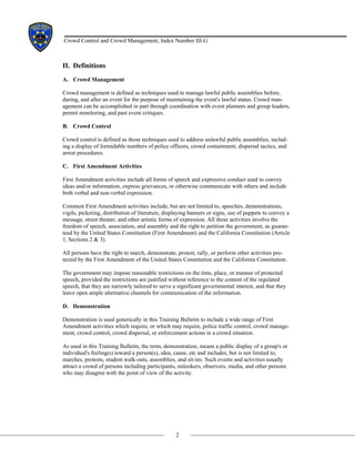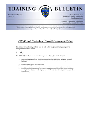 The document is a training bulletin from the Oakland Police Department outlining their crowd control and management policy. The policy aims to (1) protect life, property, and vital facilities; (2) maintain public peace and order; and (3) uphold constitutional rights while relying on minimal use of force. It defines crowd management and crowd control techniques and outlines general principles like planning, deployment, policing crowds, and responses to planned and spontaneous crowd situations. The policy stresses communication, de-escalation, and protecting constitutional rights.