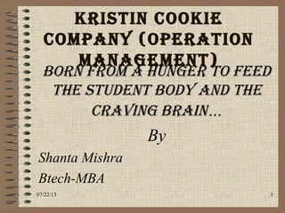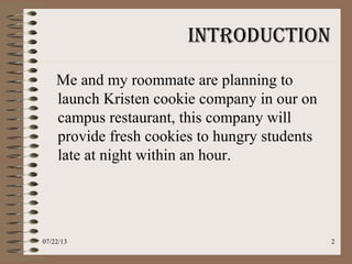 This document outlines a plan for a student-run cookie delivery business called Kristen Cookie Company. It discusses the production process, including baking times, equipment needs, and order fulfillment times. It estimates it would take 26 minutes to fulfill a rush order. The document also considers pricing strategies, noting discounts could be offered for multiple-dozen orders. It determines one electric mixer and at least three baking trays would be needed. Finally, it lists other factors to consider in the planning process, such as market demand, costs, labor needs, product improvements, and legal requirements.