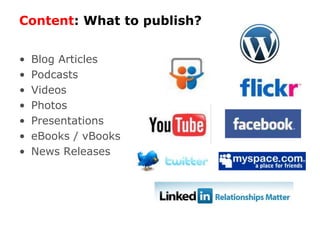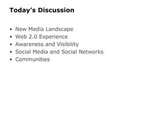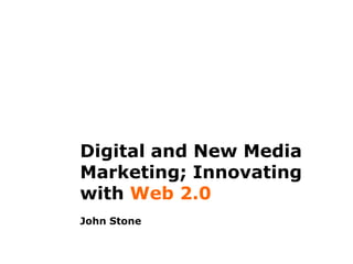 This document discusses digital and new media marketing strategies using Web 2.0. It notes the rise of social media platforms and user-generated content. Key concepts covered include social software, folksonomy, the long tail, architecture of participation, and inbound marketing. Specific tactics recommended are blogs, social networks, videos, mobile apps, and communities to build awareness, capture leads, and nurture customers. Search engine optimization, content marketing, and community engagement are emphasized.