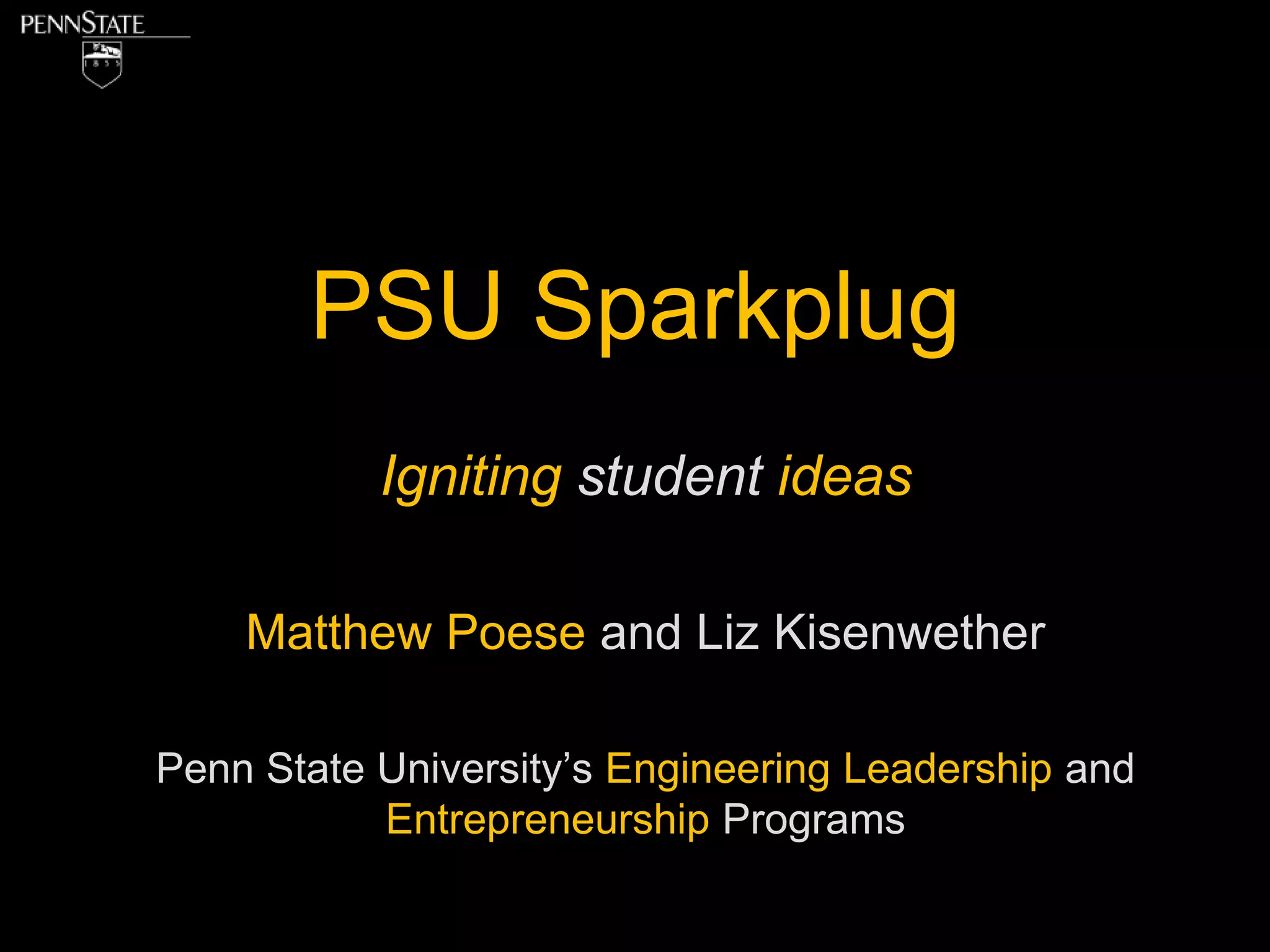 PSU's Sparkplug program provides $500 grants to student groups to fund crowd-sourced funding campaigns for their ideas on platforms like Kickstarter. This helps students build prototypes, create marketing videos, and get web hosting space. One successful group, SmartPurse, used their grant for advertising and raised over $5k on IndieGoGo to further develop their flexible purse design. The Sparkplug program aims to ignite student ideas and move them towards commercialization through collaboration across disciplines.