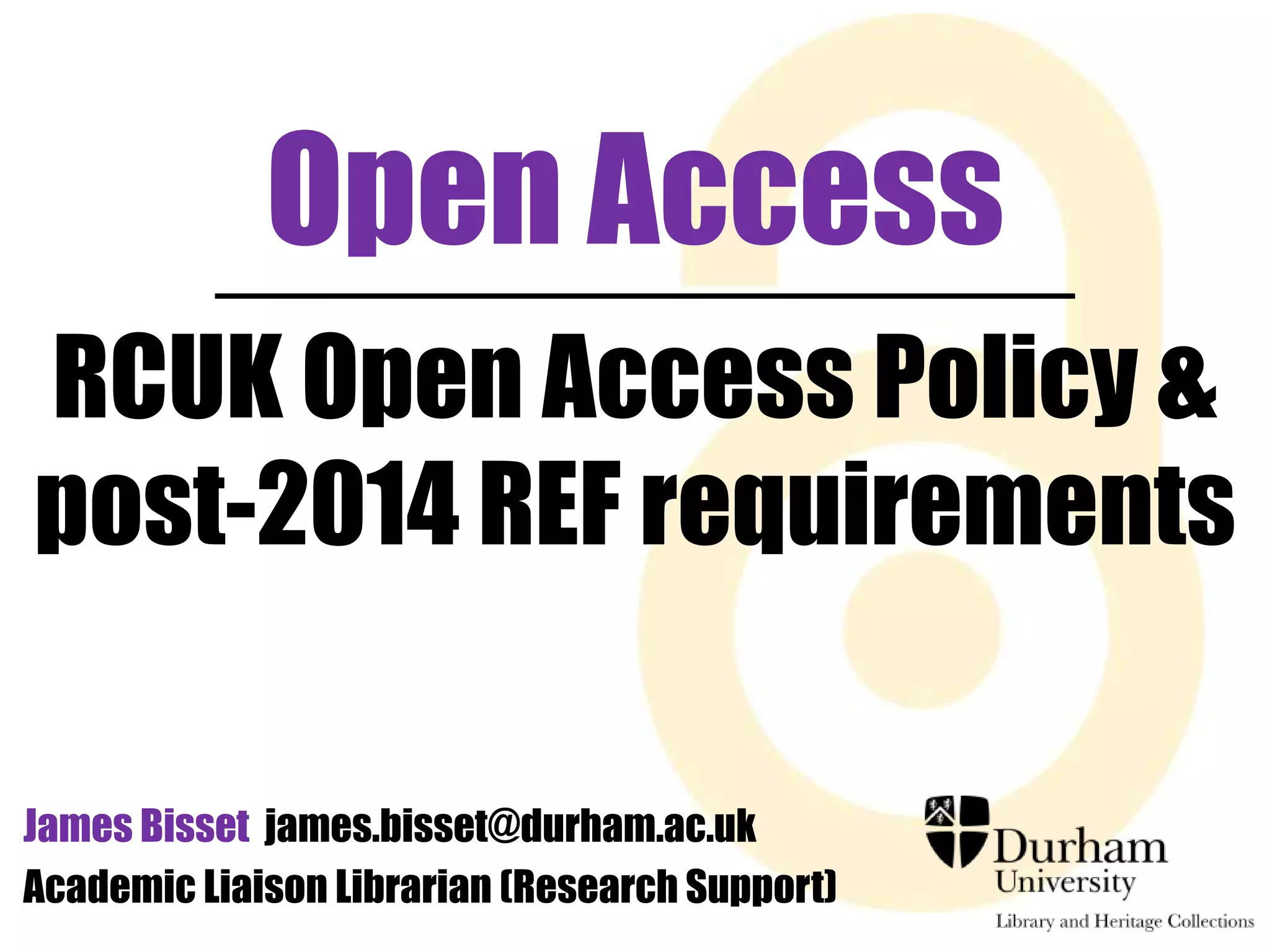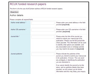 The document outlines the open access policy of the UK Research Councils (RCUK) and its implications for researchers, emphasizing the need for compliance when publishing peer-reviewed articles. Key requirements include the necessity for authors to acknowledge funding sources, provide access to research data, and ensure publication in compliant journals. It also discusses options for authors regarding open access publishing, funding for article processing charges, and access limitations faced by various institutions.