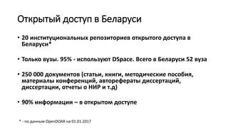 Документ касается состояния открытого доступа в Беларуси, где функционирует 20 институциональных репозиториев, и 95% из них используют платформу DSpace. В стране находится 52 вуза, в которых хранится 250 000 документов, 90% из которых доступны в открытом доступе. Также обсуждаются проблемы воспроизводимости научных данных и необходимость присвоения цифровых идентификаторов для улучшения их доступности.