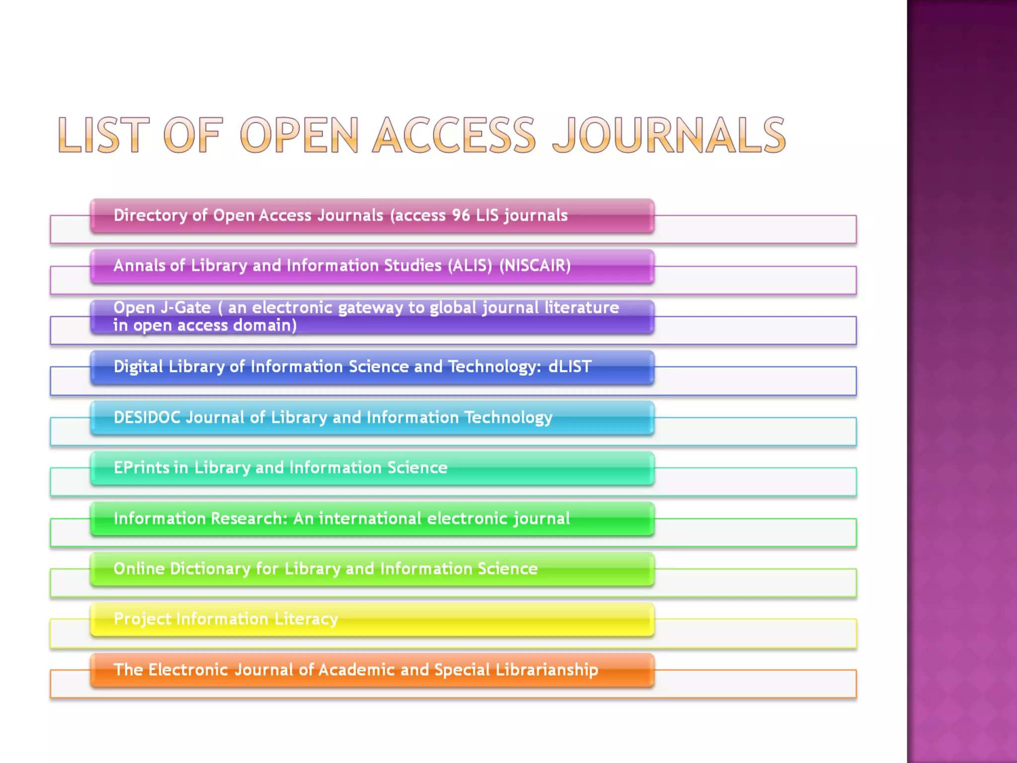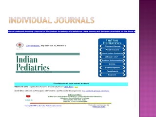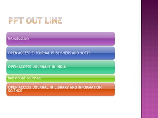 The document discusses open access literature and journals. It defines open access as online, free of charge literature without copyright or licensing restrictions. Open access journals do not charge readers or institutions for access. They cover their costs through article processing fees, advertising, or subsidies. The document lists several open access journal publishers and databases. It also discusses Indian open access biomedical journals and databases like IndMED and MedKnow. Finally, it provides a list of 73 open access library and information science journals collected from sources like DOAJ, PubMed, and SciELO.